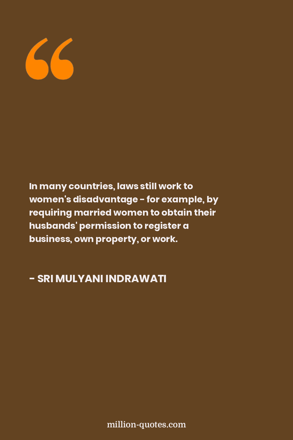 In many countries, laws still work to women's disadvantage - for example, by requiring married women to obtain their husbands' permission to register a business, own property, or work.