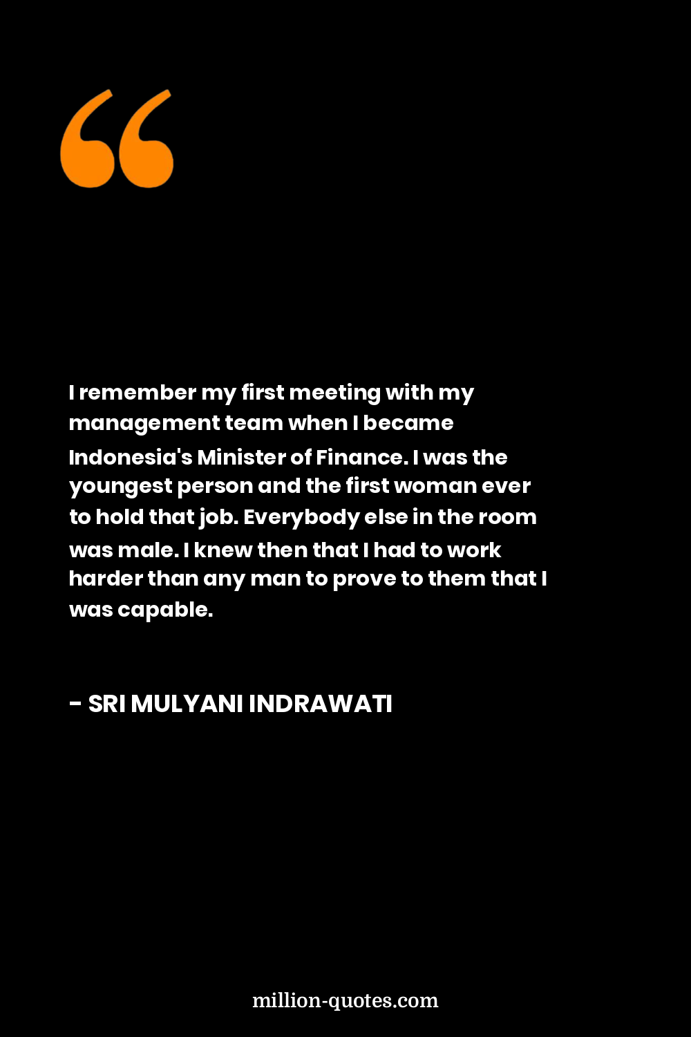 I remember my first meeting with my management team when I became Indonesia's Minister of Finance. I was the youngest person and the first woman ever to hold that job. Everybody else in the room was male. I knew then that I had to work harder than any man to prove to them that I was capable.