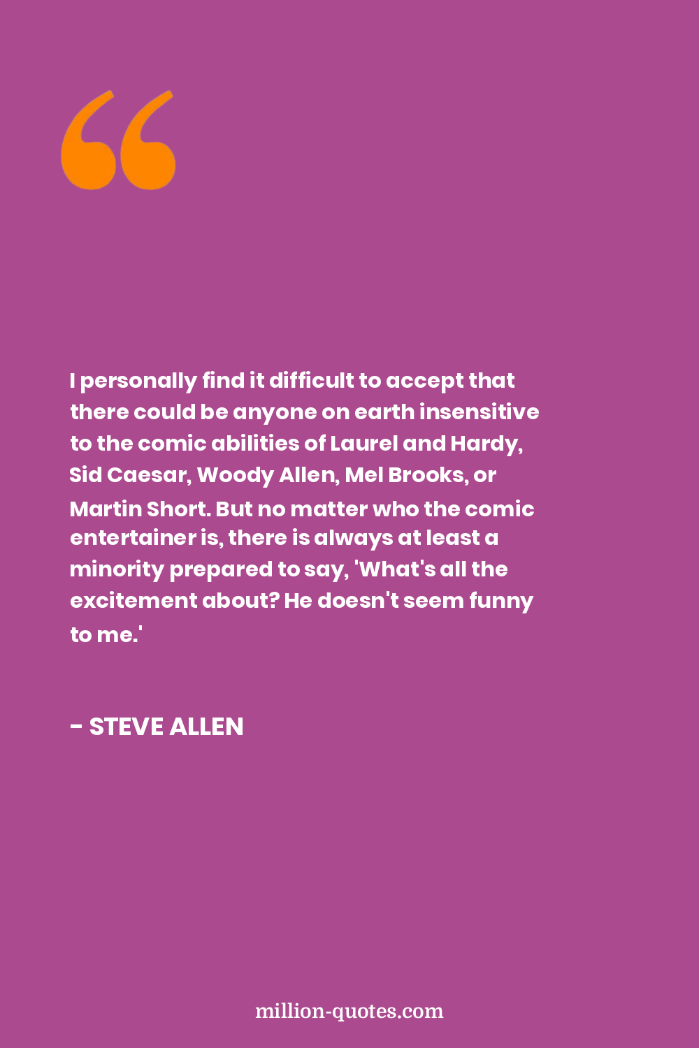 I personally find it difficult to accept that there could be anyone on earth insensitive to the comic abilities of Laurel and Hardy, Sid Caesar, Woody Allen, Mel Brooks, or Martin Short. But no matter who the comic entertainer is, there is always at least a minority prepared to say, 'What's all the excitement about? He doesn't seem funny to me.'