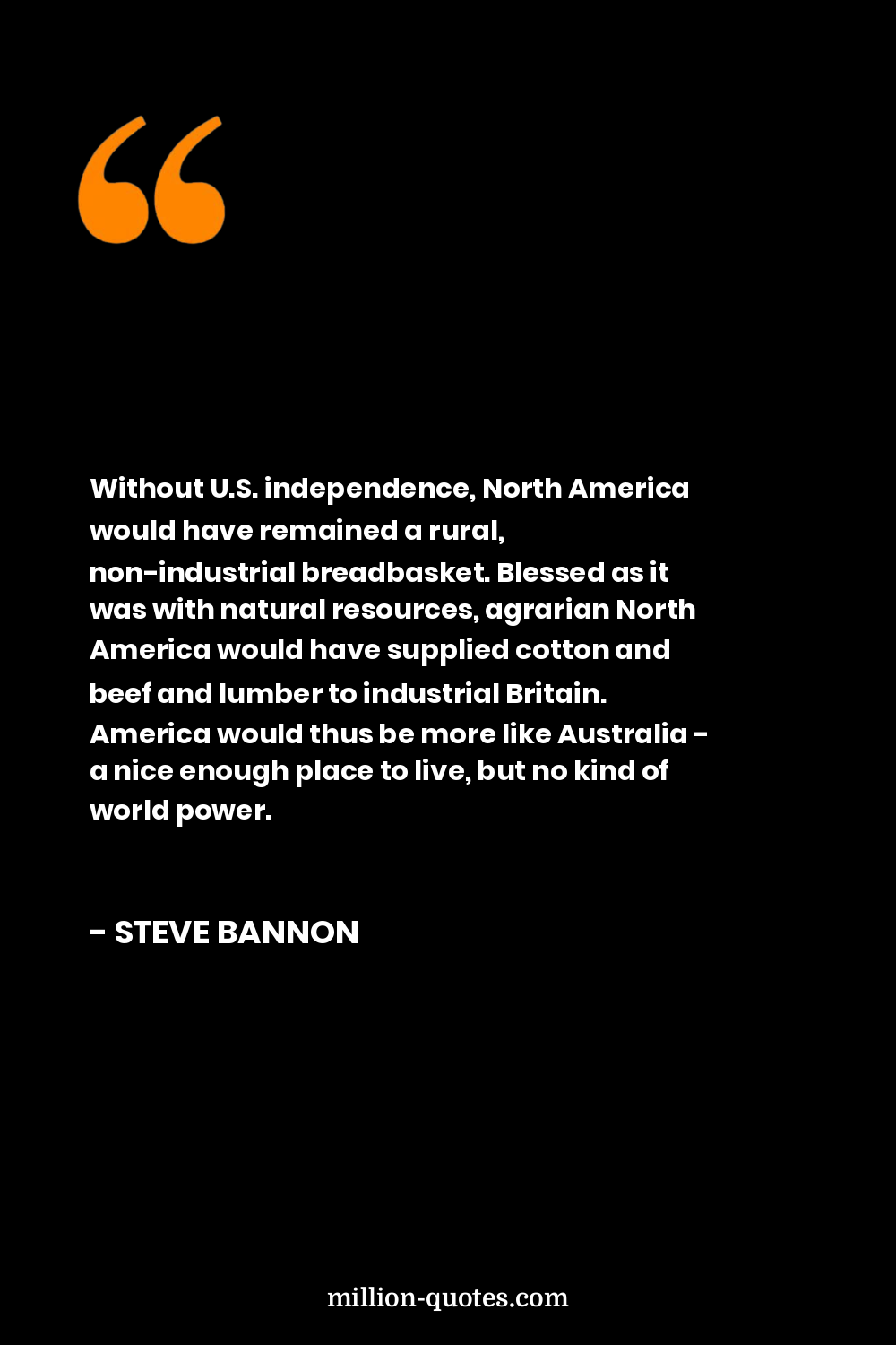 Without U.S. independence, North America would have remained a rural, non-industrial breadbasket. Blessed as it was with natural resources, agrarian North America would have supplied cotton and beef and lumber to industrial Britain. America would thus be more like Australia - a nice enough place to live, but no kind of world power.