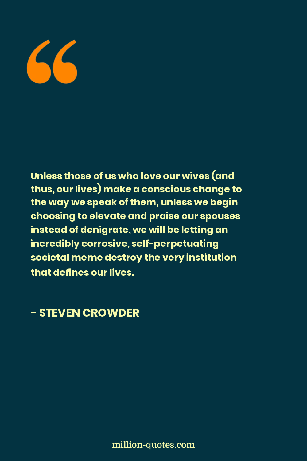 Unless those of us who love our wives (and thus, our lives) make a conscious change to the way we speak of them, unless we begin choosing to elevate and praise our spouses instead of denigrate, we will be letting an incredibly corrosive, self-perpetuating societal meme destroy the very institution that defines our lives.