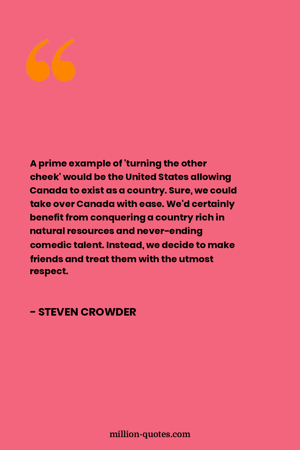 A prime example of 'turning the other cheek' would be the United States allowing Canada to exist as a country. Sure, we could take over Canada with ease. We'd certainly benefit from conquering a country rich in natural resources and never-ending comedic talent. Instead, we decide to make friends and treat them with the utmost respect.
