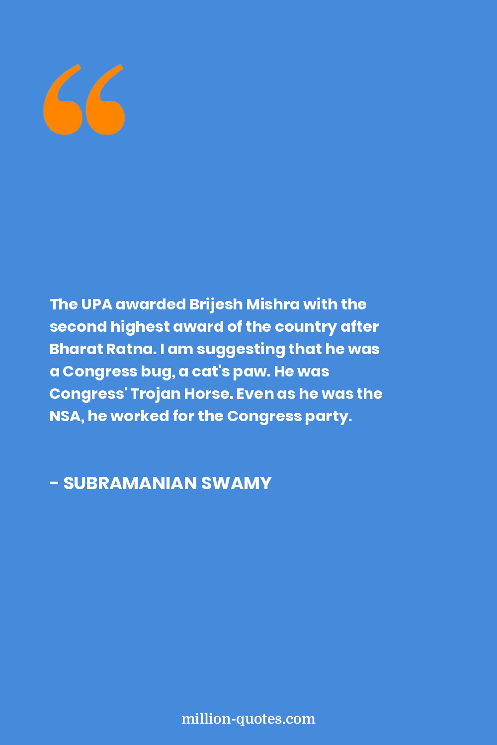 The UPA awarded Brijesh Mishra with the second highest award of the country after Bharat Ratna. I am suggesting that he was a Congress bug, a cat's paw. He was Congress' Trojan Horse. Even as he was the NSA, he worked for the Congress party.