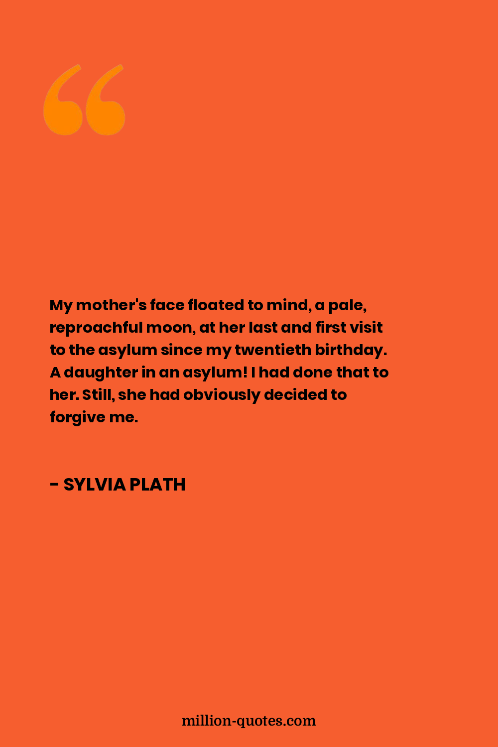 My mother's face floated to mind, a pale, reproachful moon, at her last and first visit to the asylum since my twentieth birthday. A daughter in an asylum! I had done that to her. Still, she had obviously decided to forgive me.