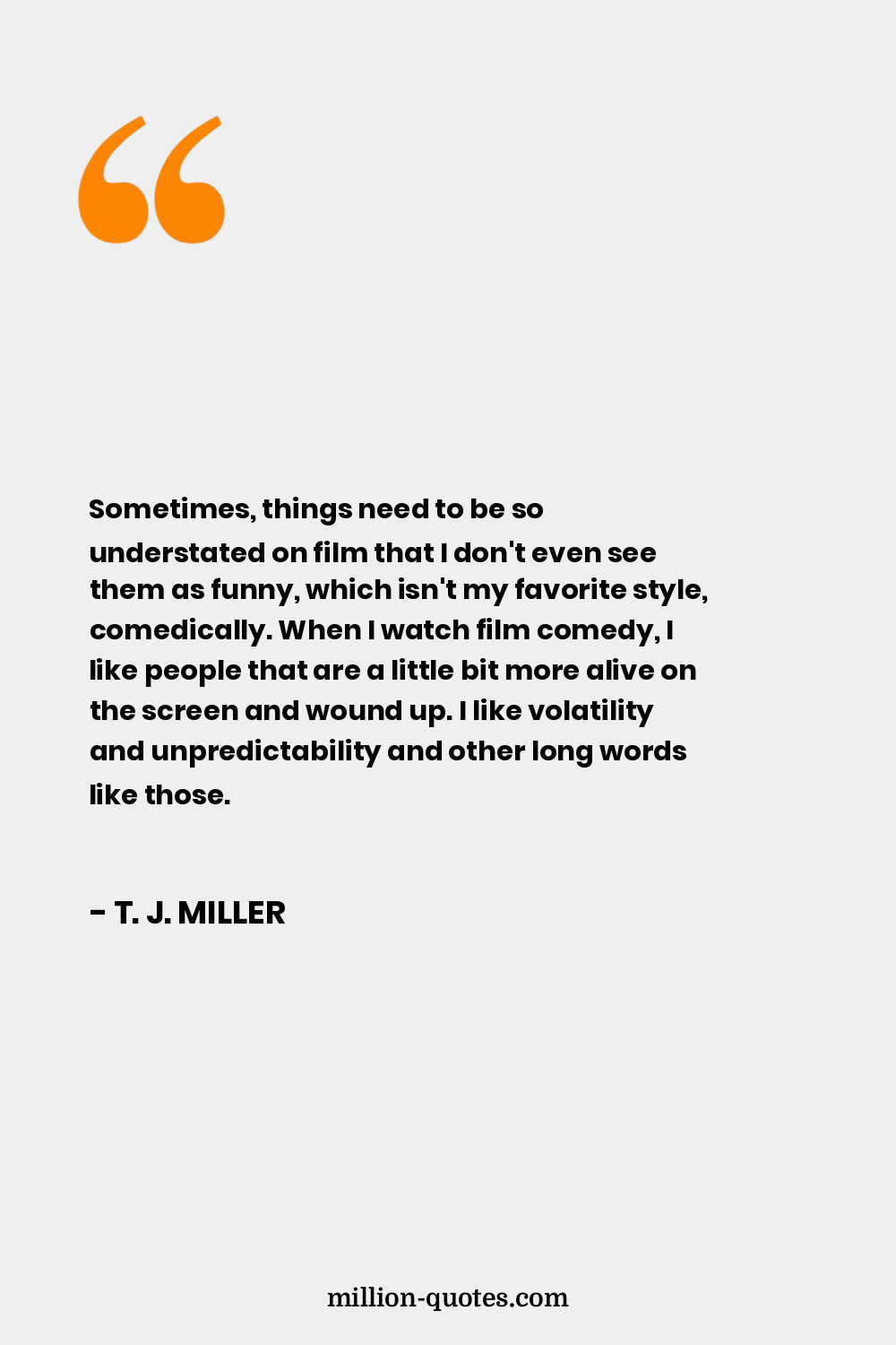 Sometimes, things need to be so understated on film that I don't even see them as funny, which isn't my favorite style, comedically. When I watch film comedy, I like people that are a little bit more alive on the screen and wound up. I like volatility and unpredictability and other long words like those.