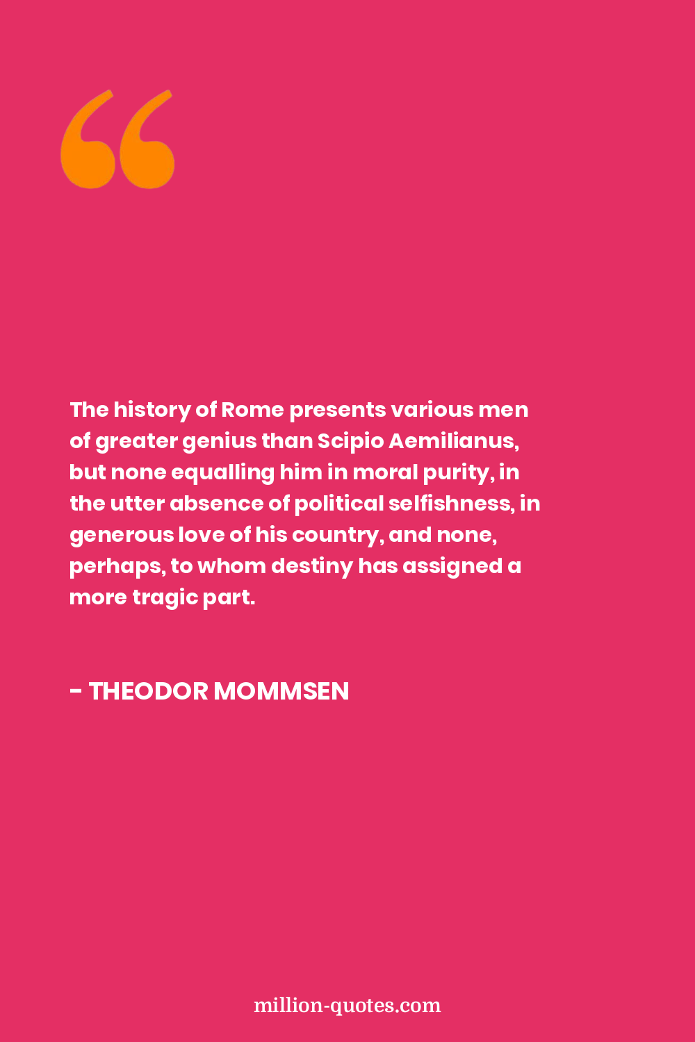 The history of Rome presents various men of greater genius than Scipio Aemilianus, but none equalling him in moral purity, in the utter absence of political selfishness, in generous love of his country, and none, perhaps, to whom destiny has assigned a more tragic part.