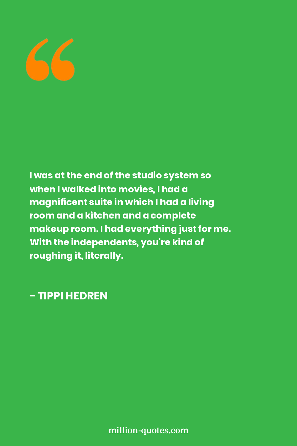 I was at the end of the studio system so when I walked into movies, I had a magnificent suite in which I had a living room and a kitchen and a complete makeup room. I had everything just for me. With the independents, you're kind of roughing it, literally.
