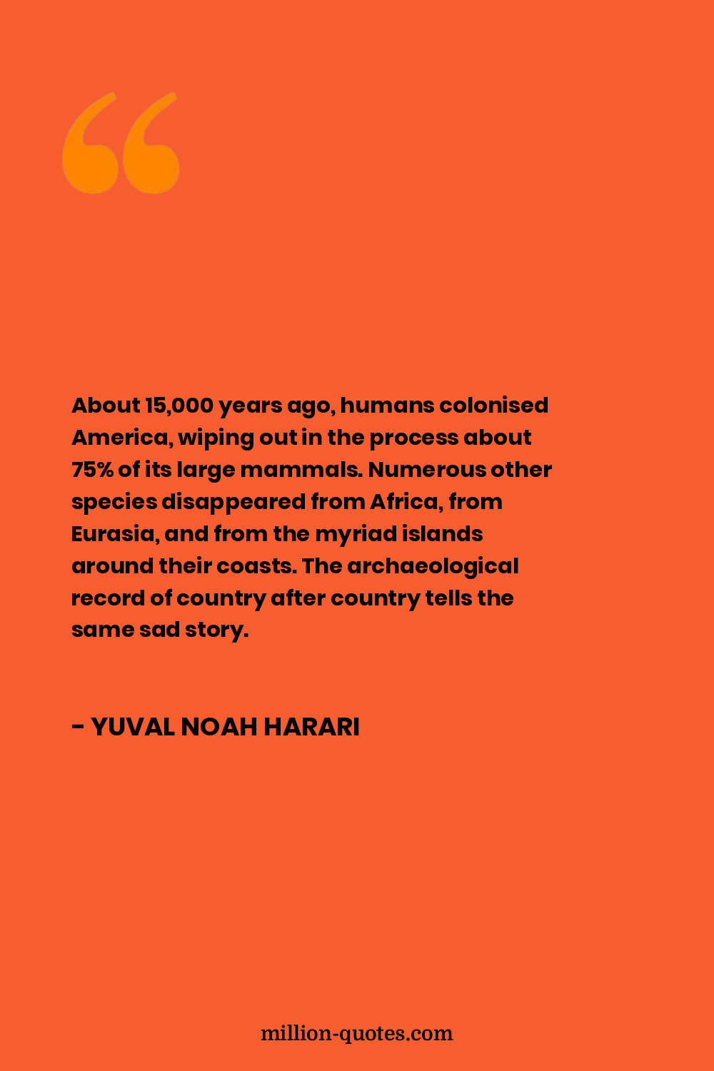 About 15,000 years ago, humans colonised America, wiping out in the process about 75% of its large mammals. Numerous other species disappeared from Africa, from Eurasia, and from the myriad islands around their coasts. The archaeological record of country after country tells the same sad story.