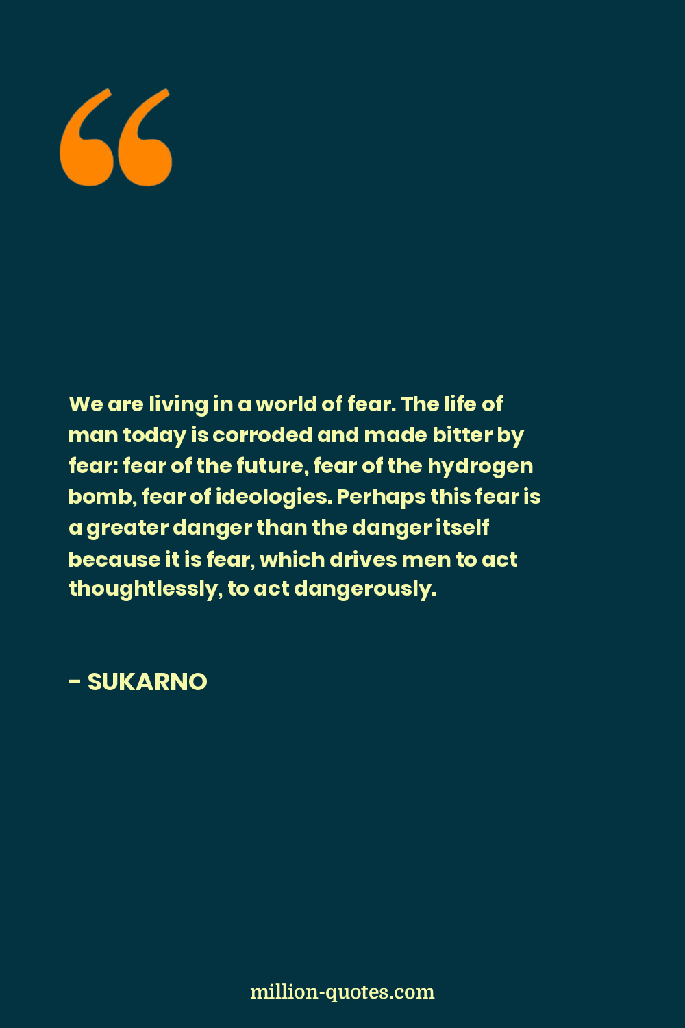 We are living in a world of fear. The life of man today is corroded and made bitter by fear: fear of the future, fear of the hydrogen bomb, fear of ideologies. Perhaps this fear is a greater danger than the danger itself because it is fear, which drives men to act thoughtlessly, to act dangerously.
