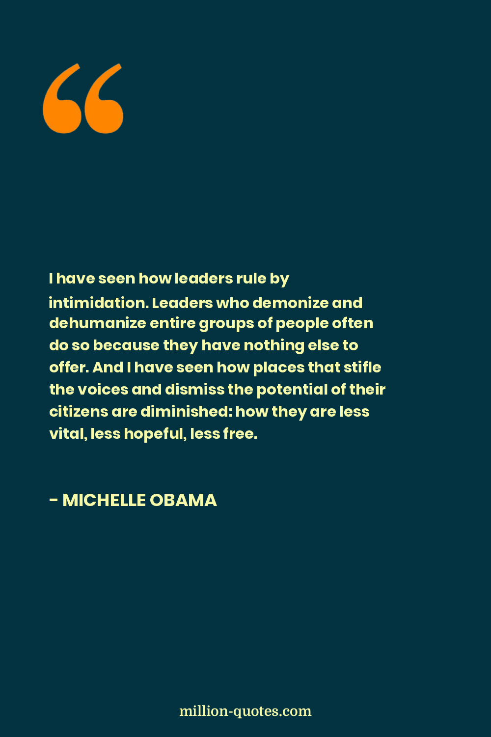 I have seen how leaders rule by intimidation. Leaders who demonize and dehumanize entire groups of people often do so because they have nothing else to offer. And I have seen how places that stifle the voices and dismiss the potential of their citizens are diminished: how they are less vital, less hopeful, less free.