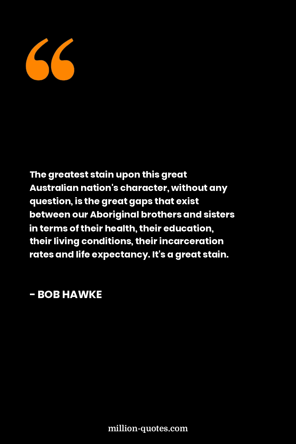 The greatest stain upon this great Australian nation's character, without any question, is the great gaps that exist between our Aboriginal brothers and sisters in terms of their health, their education, their living conditions, their incarceration rates and life expectancy. It's a great stain.