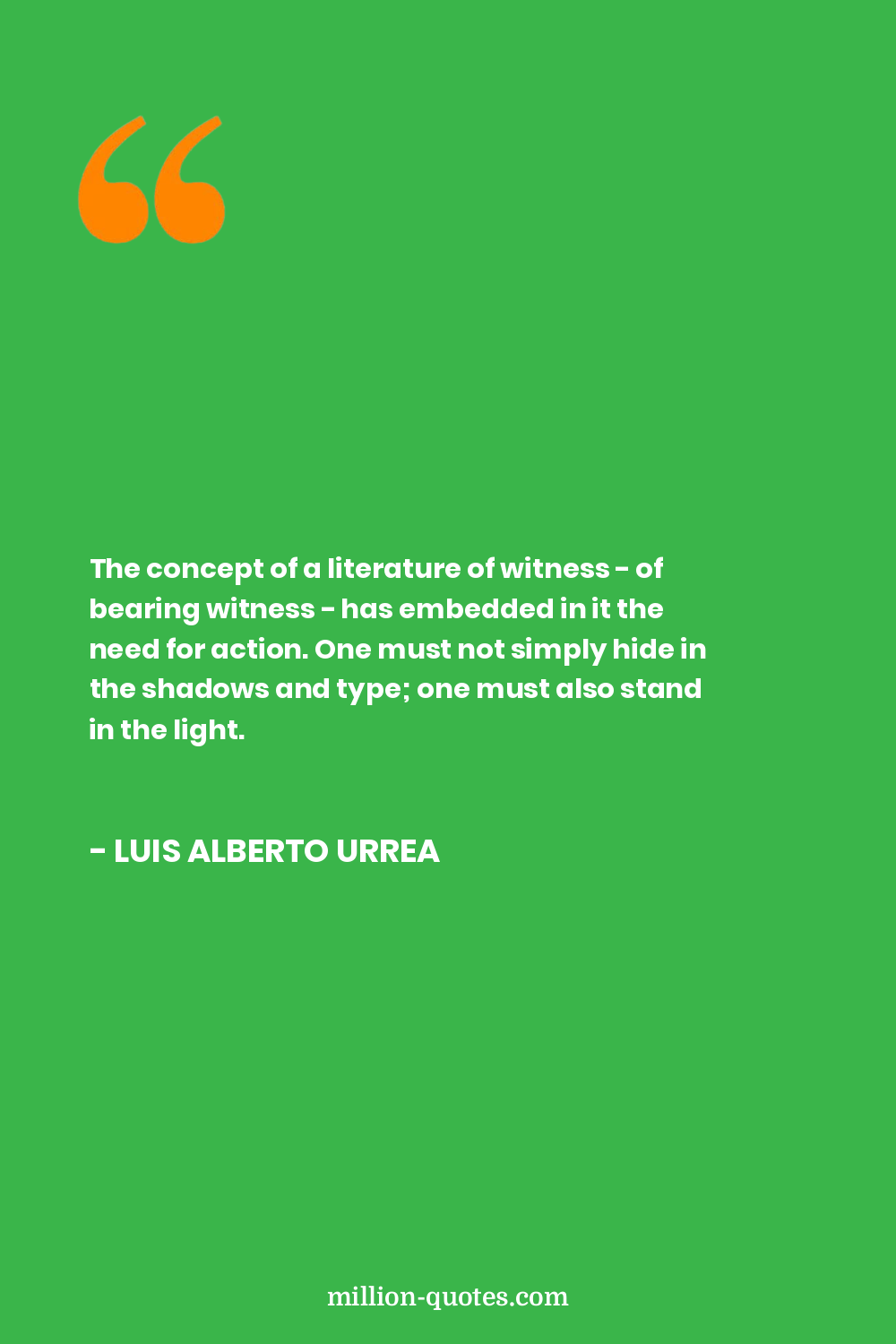 The concept of a literature of witness - of bearing witness - has embedded in it the need for action. One must not simply hide in the shadows and type; one must also stand in the light.