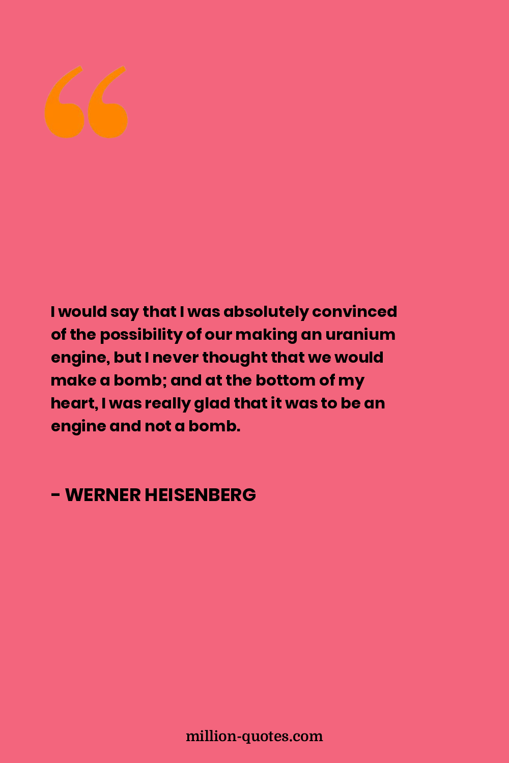 The German physicists knew at least so much about the manufacture and construction of atomic bombs that it was clear to them that the manufacture of bombs in Germany could not succeed during the war. For this reason, they were spared the moral decision whether they should make an atomic bomb, and they had only worked on the uranium engine.