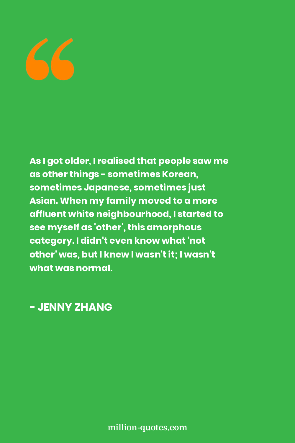 As I got older, I realised that people saw me as other things - sometimes Korean, sometimes Japanese, sometimes just Asian. When my family moved to a more affluent white neighbourhood, I started to see myself as 'other', this amorphous category. I didn't even know what 'not other' was, but I knew I wasn't it; I wasn't what was normal.