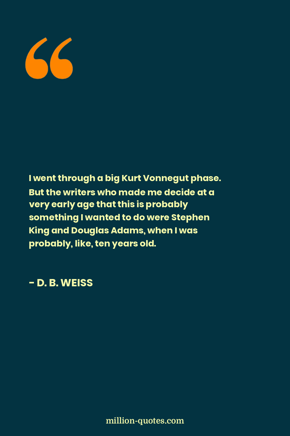 I went through a big Kurt Vonnegut phase. But the writers who made me decide at a very early age that this is probably something I wanted to do were Stephen King and Douglas Adams, when I was probably, like, ten years old.