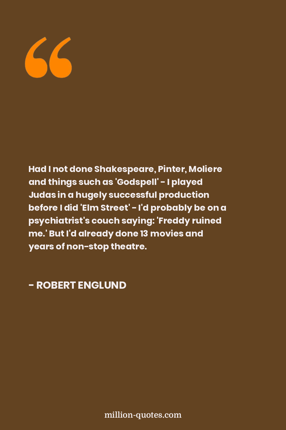 Had I not done Shakespeare, Pinter, Moliere and things such as 'Godspell' - I played Judas in a hugely successful production before I did 'Elm Street' - I'd probably be on a psychiatrist's couch saying: 'Freddy ruined me.' But I'd already done 13 movies and years of non-stop theatre.
