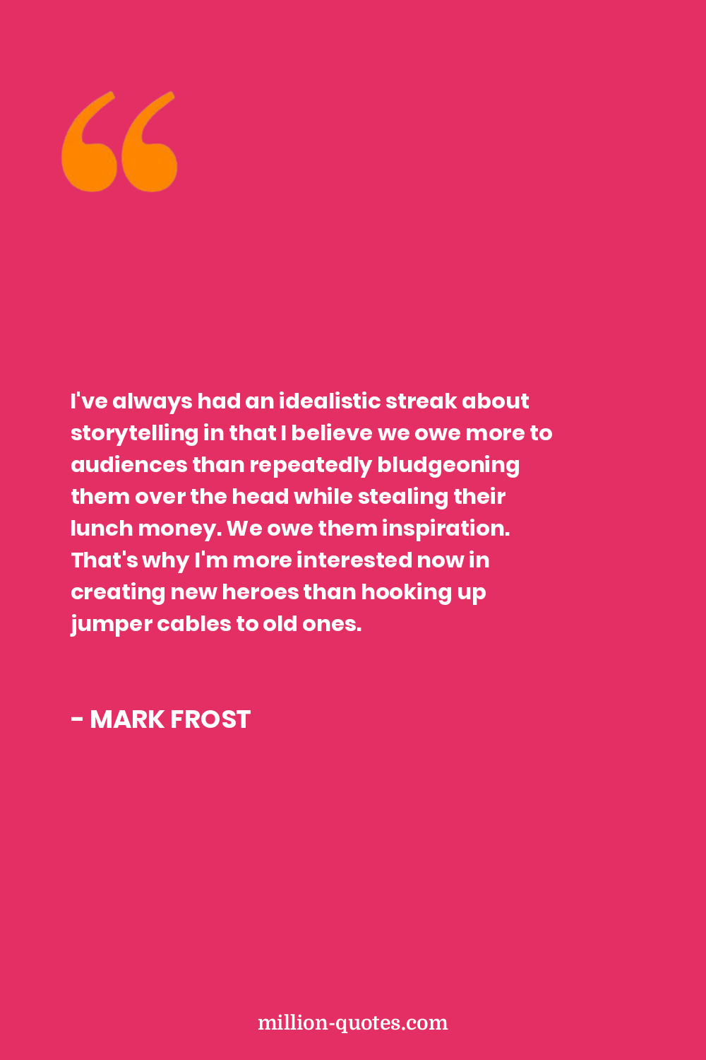 I've always had an idealistic streak about storytelling in that I believe we owe more to audiences than repeatedly bludgeoning them over the head while stealing their lunch money. We owe them inspiration. That's why I'm more interested now in creating new heroes than hooking up jumper cables to old ones.