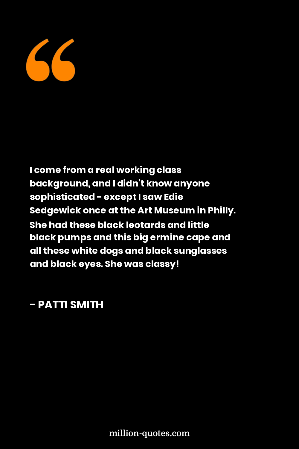 I come from a real working class background, and I didn't know anyone sophisticated - except I saw Edie Sedgewick once at the Art Museum in Philly. She had these black leotards and little black pumps and this big ermine cape and all these white dogs and black sunglasses and black eyes. She was classy!