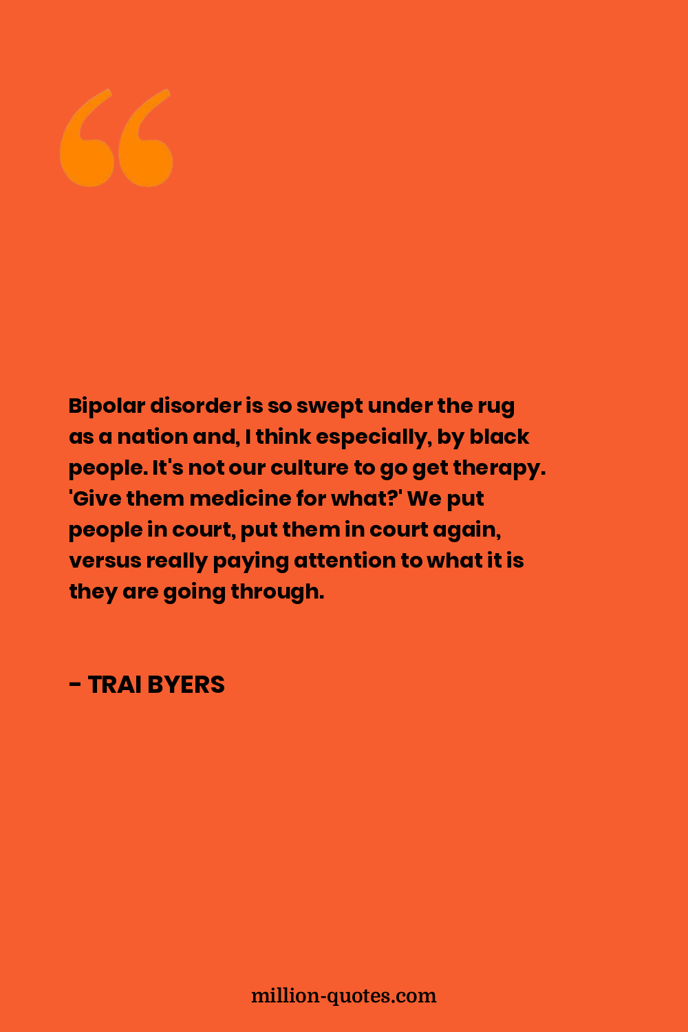 Bipolar disorder is so swept under the rug as a nation and, I think especially, by black people. It's not our culture to go get therapy. 'Give them medicine for what?' We put people in court, put them in court again, versus really paying attention to what it is they are going through.
