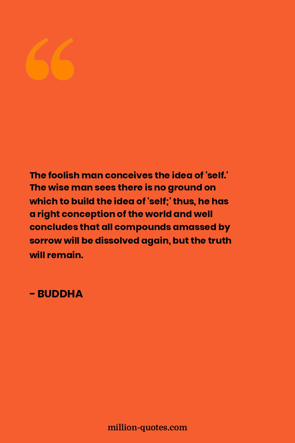 The foolish man conceives the idea of 'self.' The wise man sees there is no ground on which to build the idea of 'self;' thus, he has a right conception of the world and well concludes that all compounds amassed by sorrow will be dissolved again, but the truth will remain.