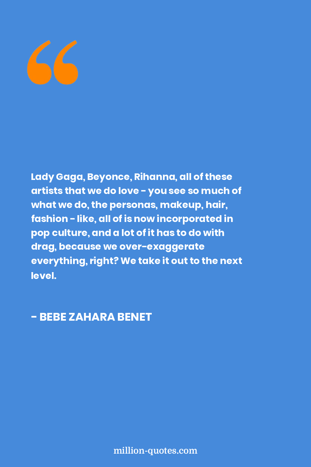 Lady Gaga, Beyonce, Rihanna, all of these artists that we do love - you see so much of what we do, the personas, makeup, hair, fashion - like, all of is now incorporated in pop culture, and a lot of it has to do with drag, because we over-exaggerate everything, right? We take it out to the next level.