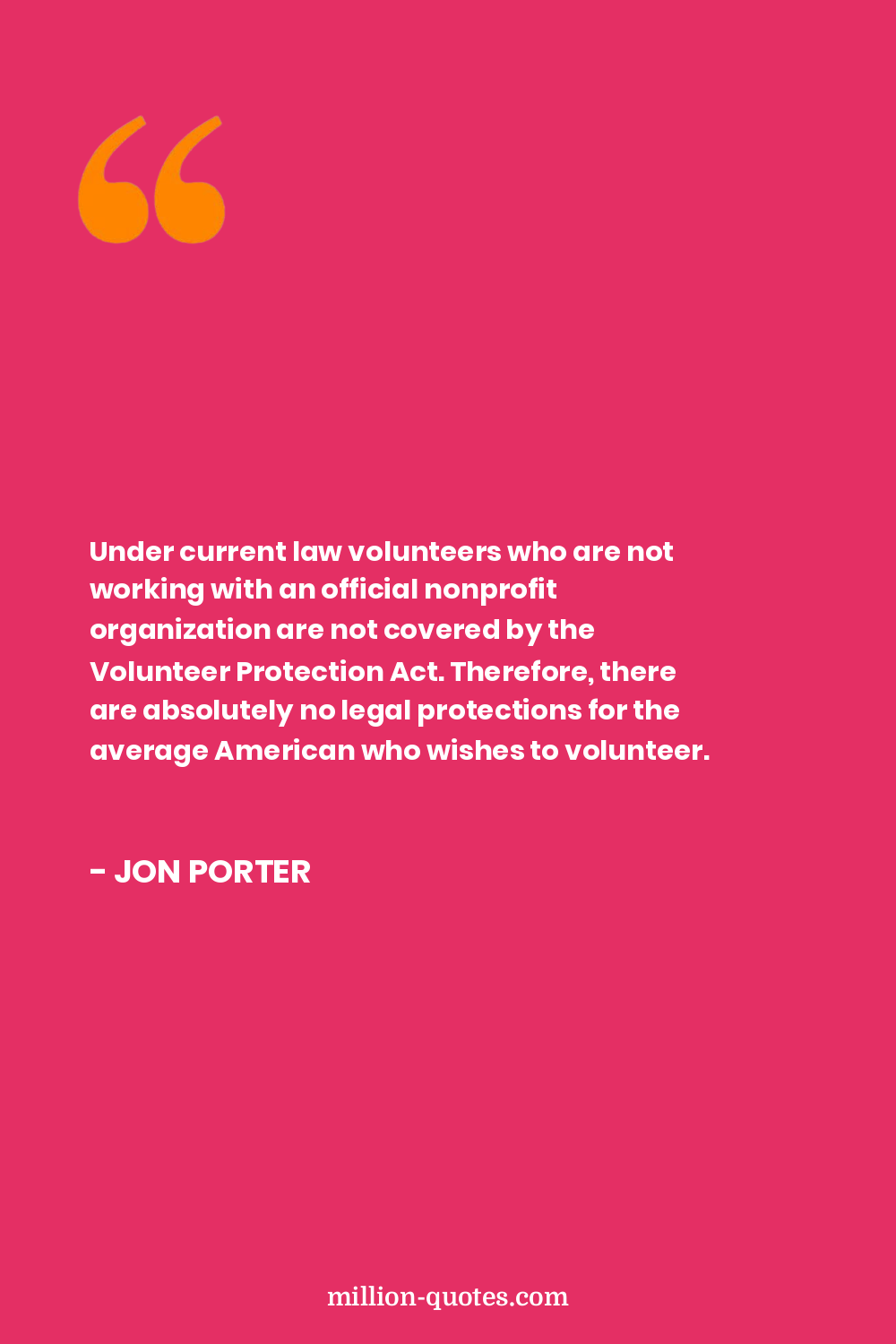 Under current law volunteers who are not working with an official nonprofit organization are not covered by the Volunteer Protection Act. Therefore, there are absolutely no legal protections for the average American who wishes to volunteer.