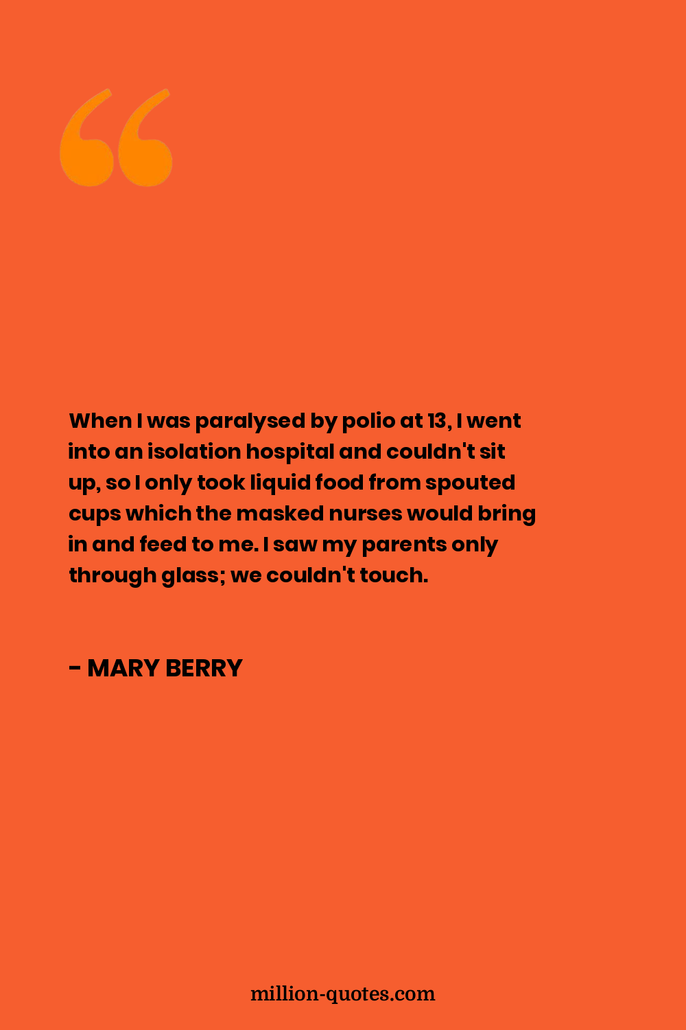 When I was paralysed by polio at 13, I went into an isolation hospital and couldn't sit up, so I only took liquid food from spouted cups which the masked nurses would bring in and feed to me. I saw my parents only through glass; we couldn't touch.