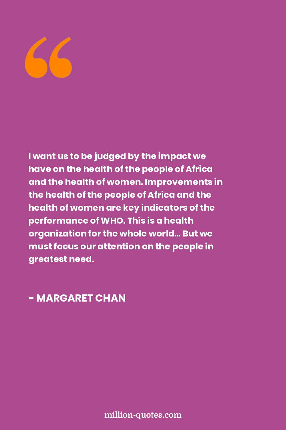 I want us to be judged by the impact we have on the health of the people of Africa and the health of women. Improvements in the health of the people of Africa and the health of women are key indicators of the performance of WHO. This is a health organization for the whole world... But we must focus our attention on the people in greatest need.