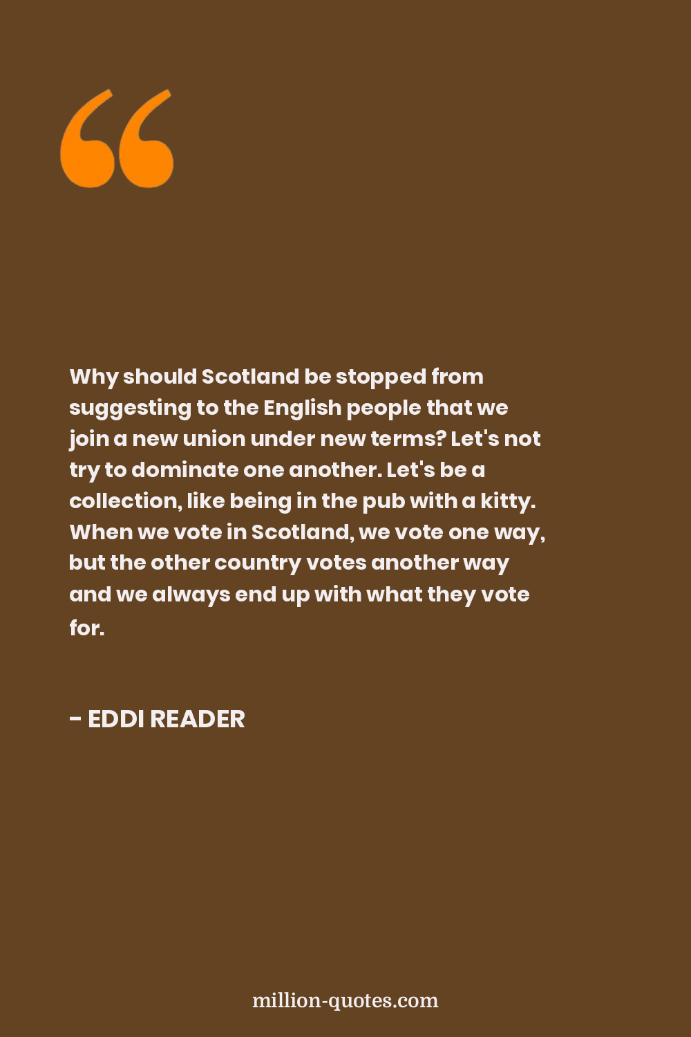 Why should Scotland be stopped from suggesting to the English people that we join a new union under new terms? Let's not try to dominate one another. Let's be a collection, like being in the pub with a kitty. When we vote in Scotland, we vote one way, but the other country votes another way and we always end up with what they vote for.