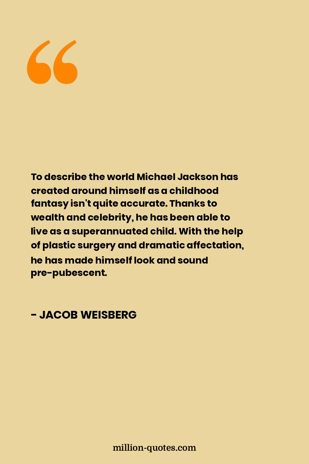 To describe the world Michael Jackson has created around himself as a childhood fantasy isn't quite accurate. Thanks to wealth and celebrity, he has been able to live as a superannuated child. With the help of plastic surgery and dramatic affectation, he has made himself look and sound pre-pubescent.