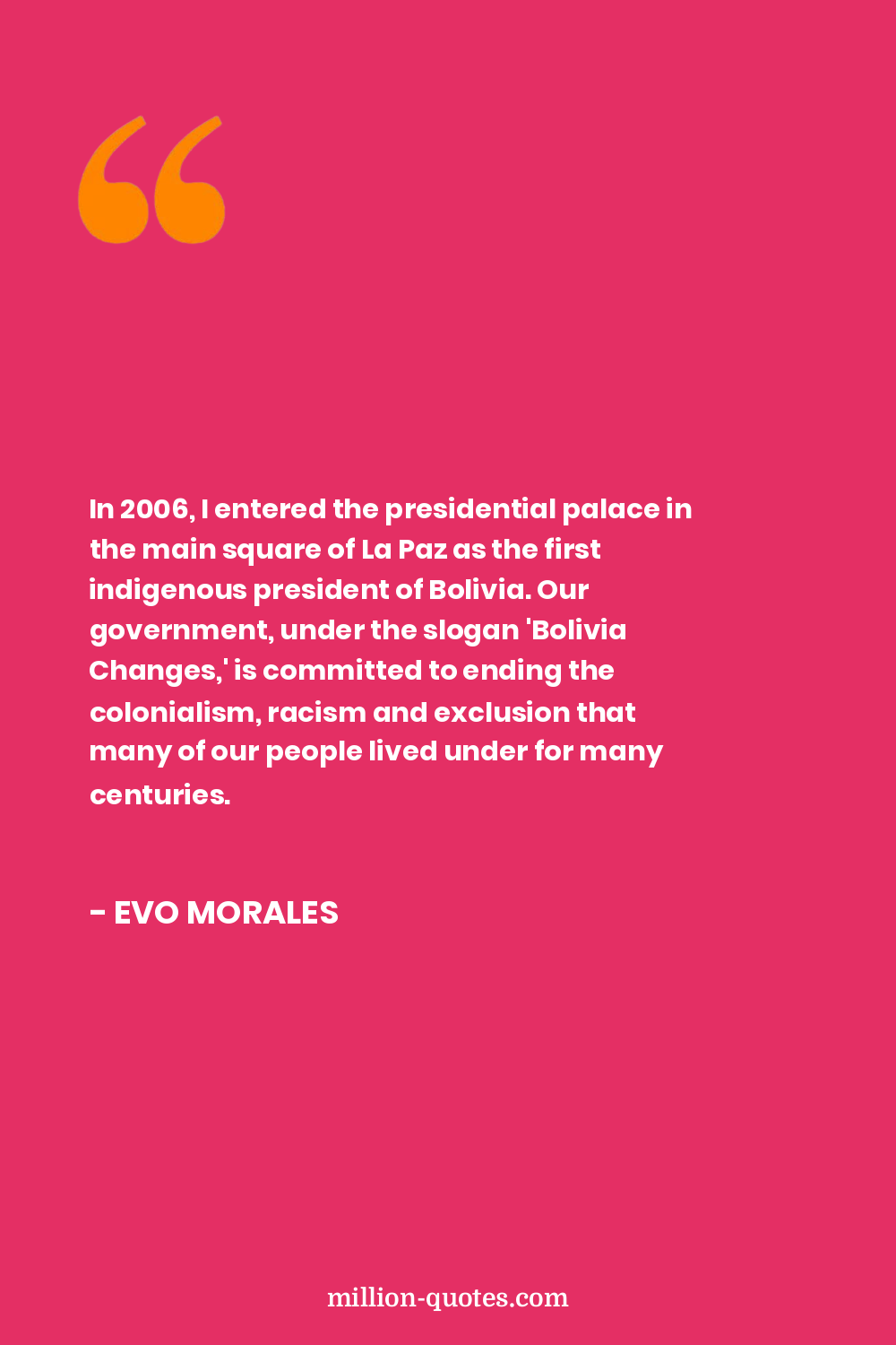 In 2006, I entered the presidential palace in the main square of La Paz as the first indigenous president of Bolivia. Our government, under the slogan 'Bolivia Changes,' is committed to ending the colonialism, racism and exclusion that many of our people lived under for many centuries.