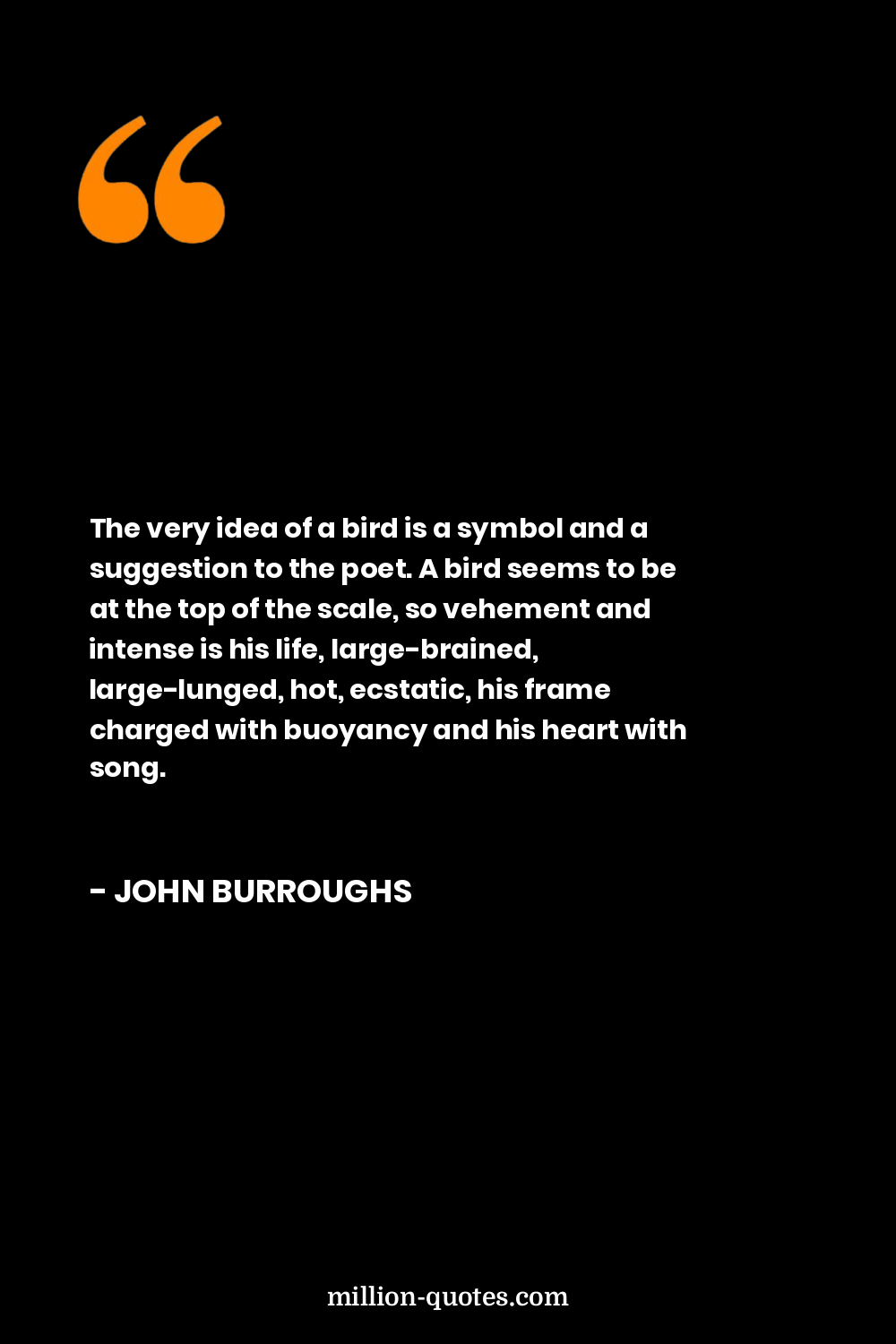 The very idea of a bird is a symbol and a suggestion to the poet. A bird seems to be at the top of the scale, so vehement and intense is his life, large-brained, large-lunged, hot, ecstatic, his frame charged with buoyancy and his heart with song.
