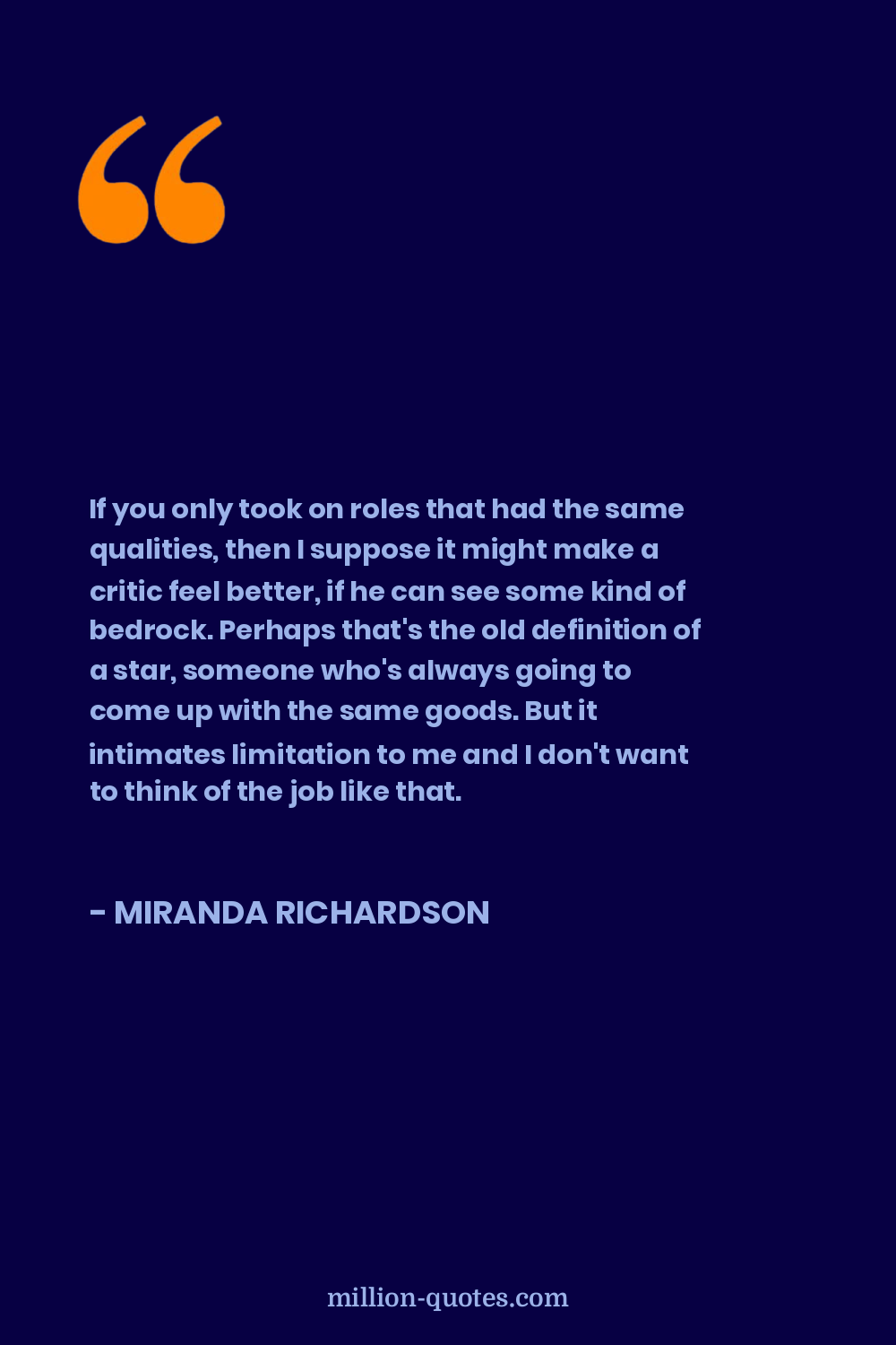 If you only took on roles that had the same qualities, then I suppose it might make a critic feel better, if he can see some kind of bedrock. Perhaps that's the old definition of a star, someone who's always going to come up with the same goods. But it intimates limitation to me and I don't want to think of the job like that.