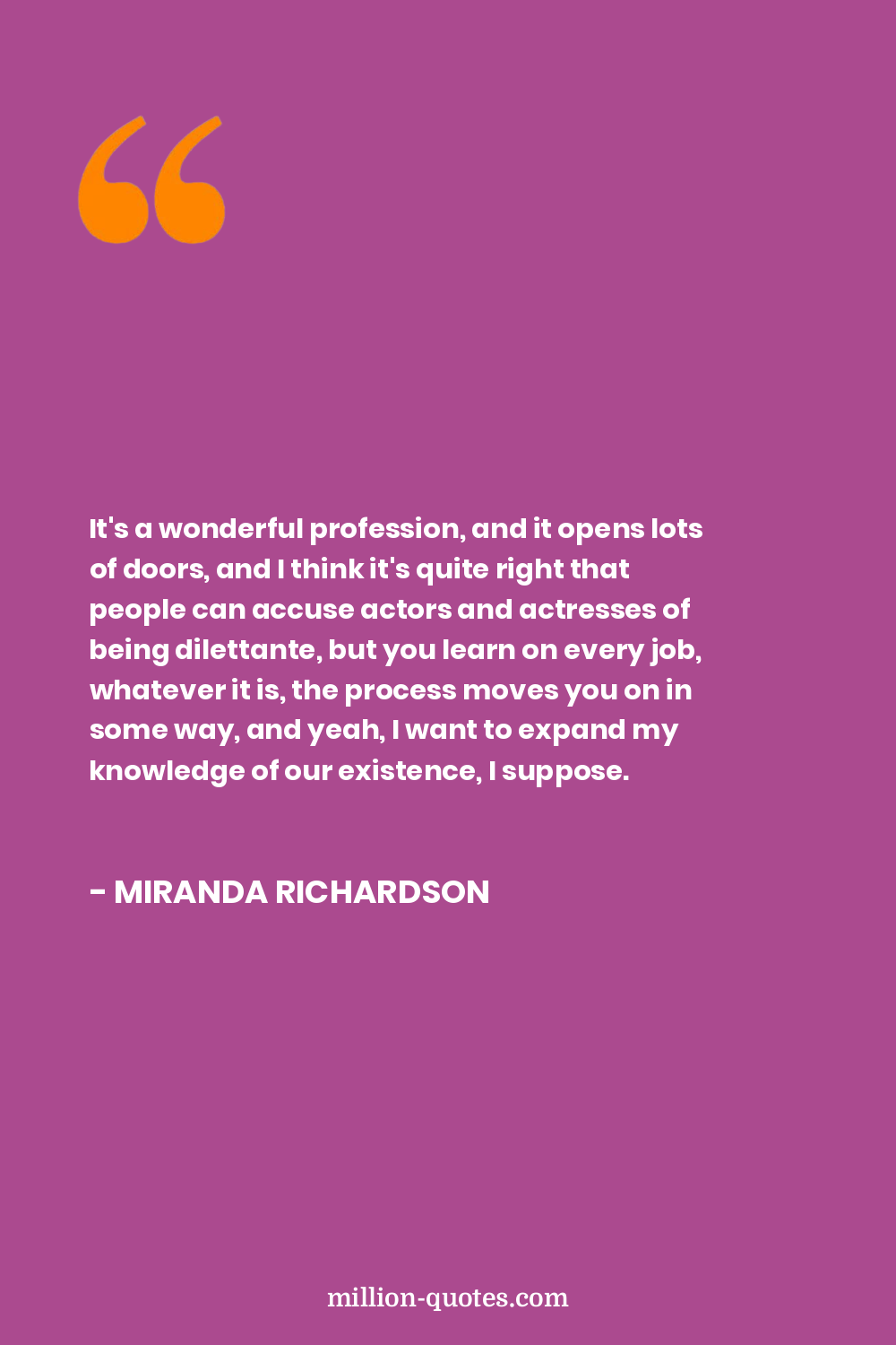 It's a wonderful profession, and it opens lots of doors, and I think it's quite right that people can accuse actors and actresses of being dilettante, but you learn on every job, whatever it is, the process moves you on in some way, and yeah, I want to expand my knowledge of our existence, I suppose.