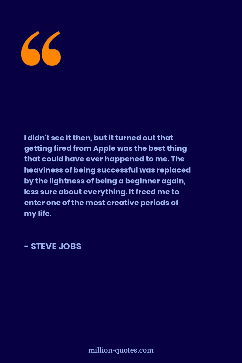 I didn't see it then, but it turned out that getting fired from Apple was the best thing that could have ever happened to me. The heaviness of being successful was replaced by the lightness of being a beginner again, less sure about everything. It freed me to enter one of the most creative periods of my life.