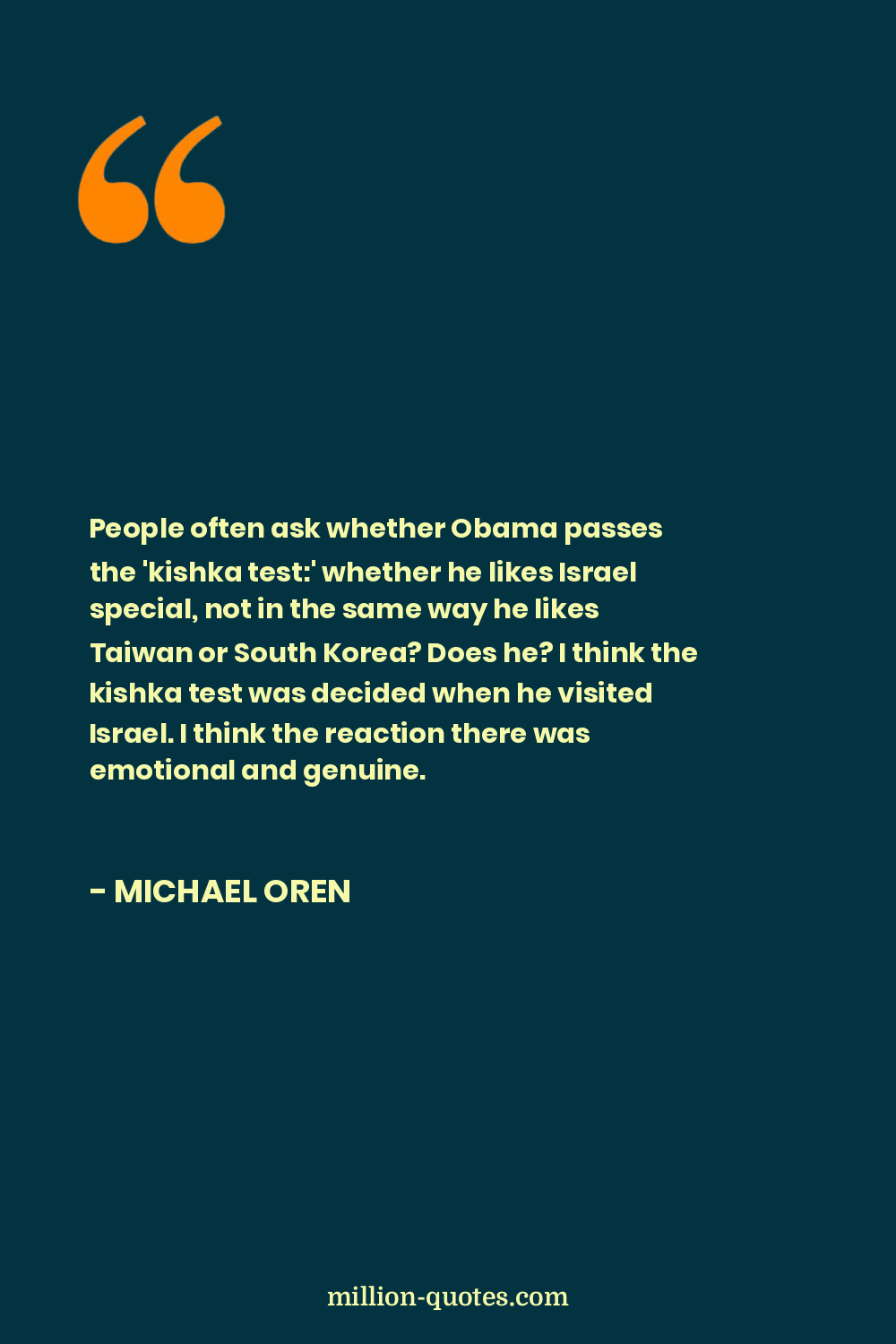 People often ask whether Obama passes the 'kishka test:' whether he likes Israel special, not in the same way he likes Taiwan or South Korea? Does he? I think the kishka test was decided when he visited Israel. I think the reaction there was emotional and genuine.