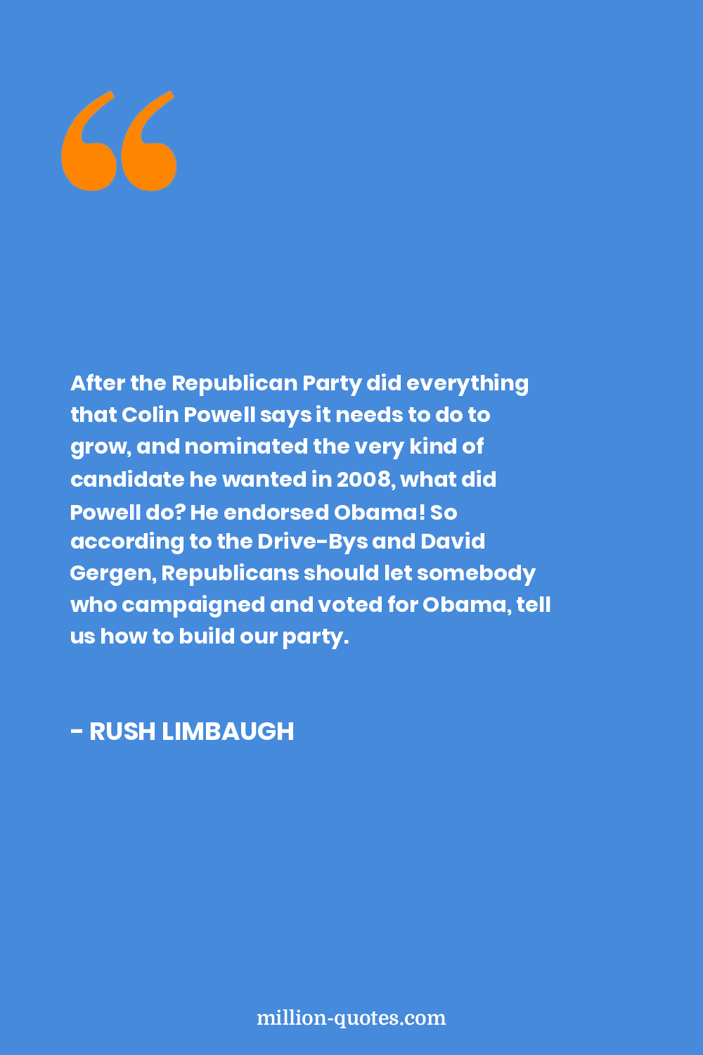 After the Republican Party did everything that Colin Powell says it needs to do to grow, and nominated the very kind of candidate he wanted in 2008, what did Powell do? He endorsed Obama! So according to the Drive-Bys and David Gergen, Republicans should let somebody who campaigned and voted for Obama, tell us how to build our party.
