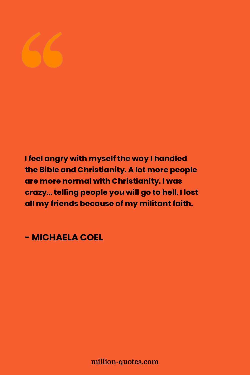 I feel angry with myself the way I handled the Bible and Christianity. A lot more people are more normal with Christianity. I was crazy... telling people you will go to hell. I lost all my friends because of my militant faith.