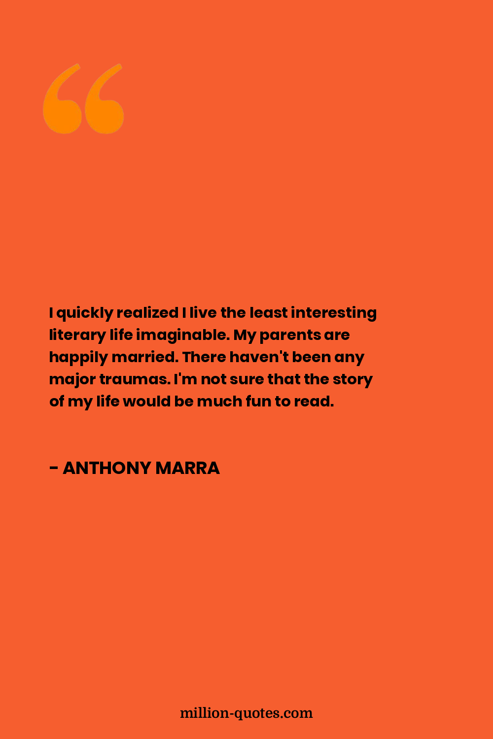 I quickly realized I live the least interesting literary life imaginable. My parents are happily married. There haven't been any major traumas. I'm not sure that the story of my life would be much fun to read.