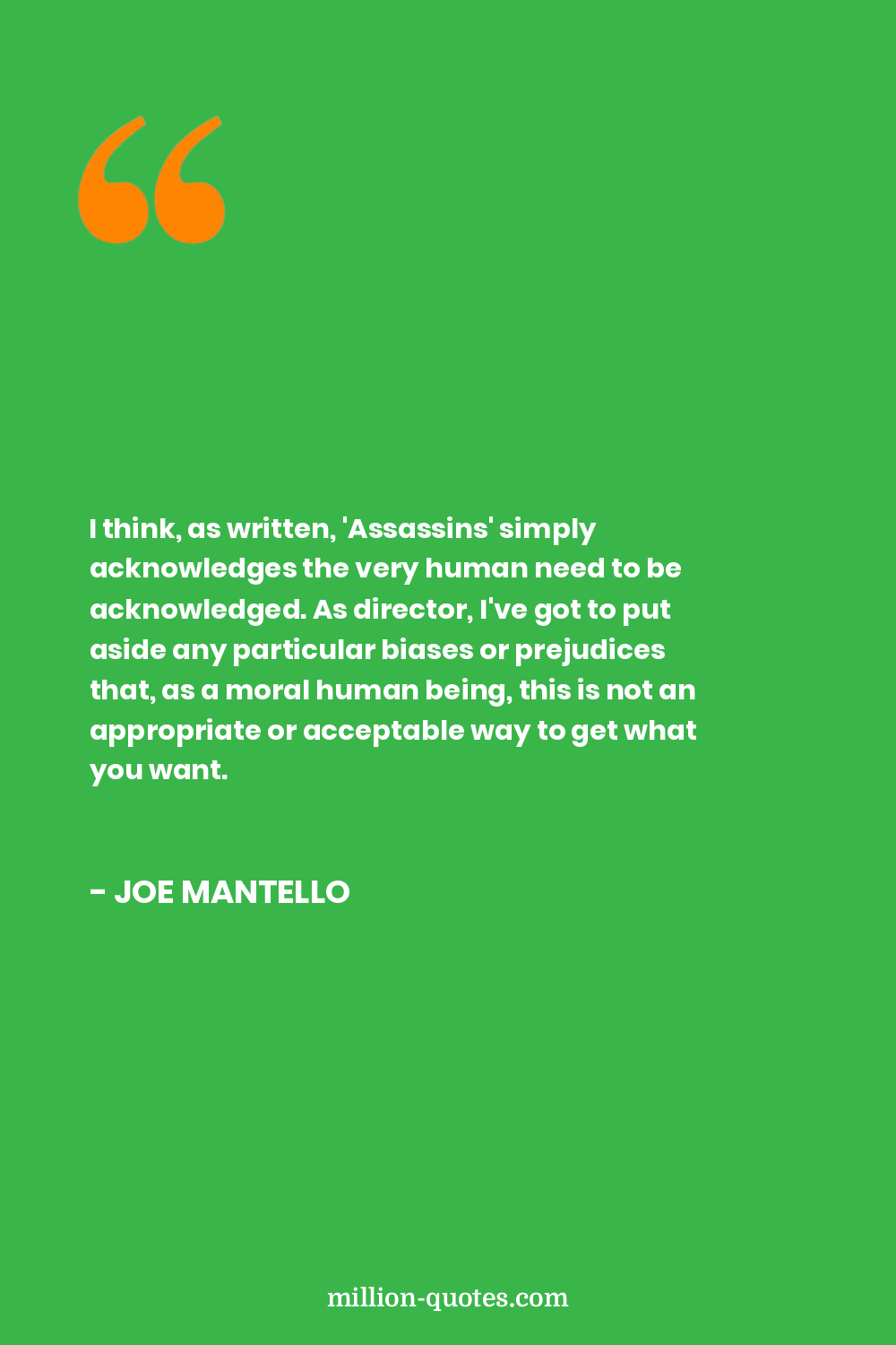 I think, as written, 'Assassins' simply acknowledges the very human need to be acknowledged. As director, I've got to put aside any particular biases or prejudices that, as a moral human being, this is not an appropriate or acceptable way to get what you want.