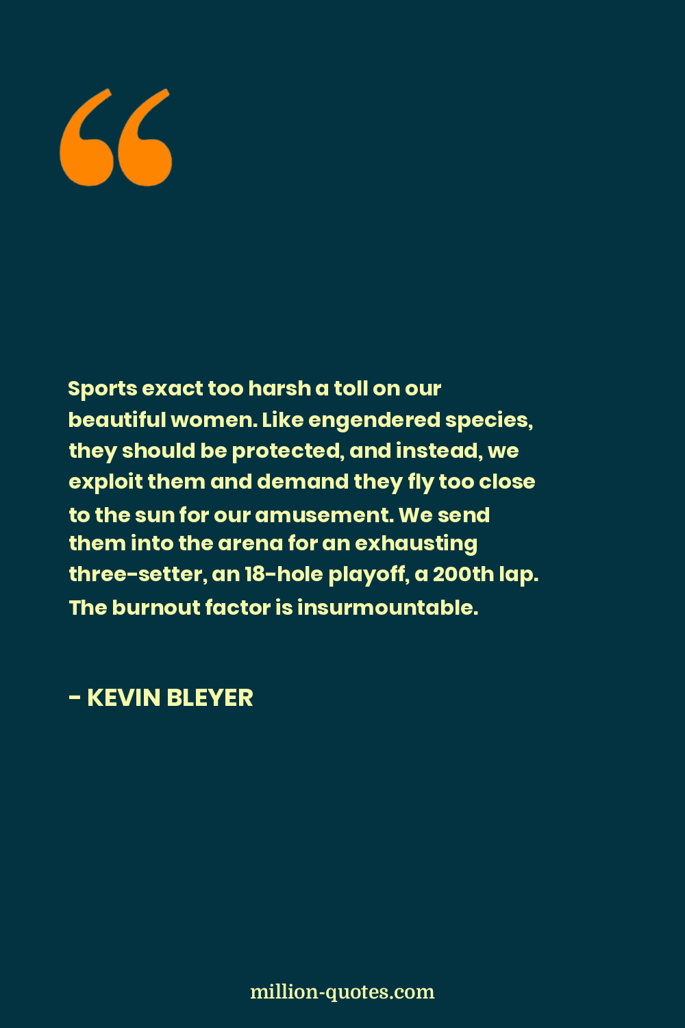 Sports exact too harsh a toll on our beautiful women. Like engendered species, they should be protected, and instead, we exploit them and demand they fly too close to the sun for our amusement. We send them into the arena for an exhausting three-setter, an 18-hole playoff, a 200th lap. The burnout factor is insurmountable.