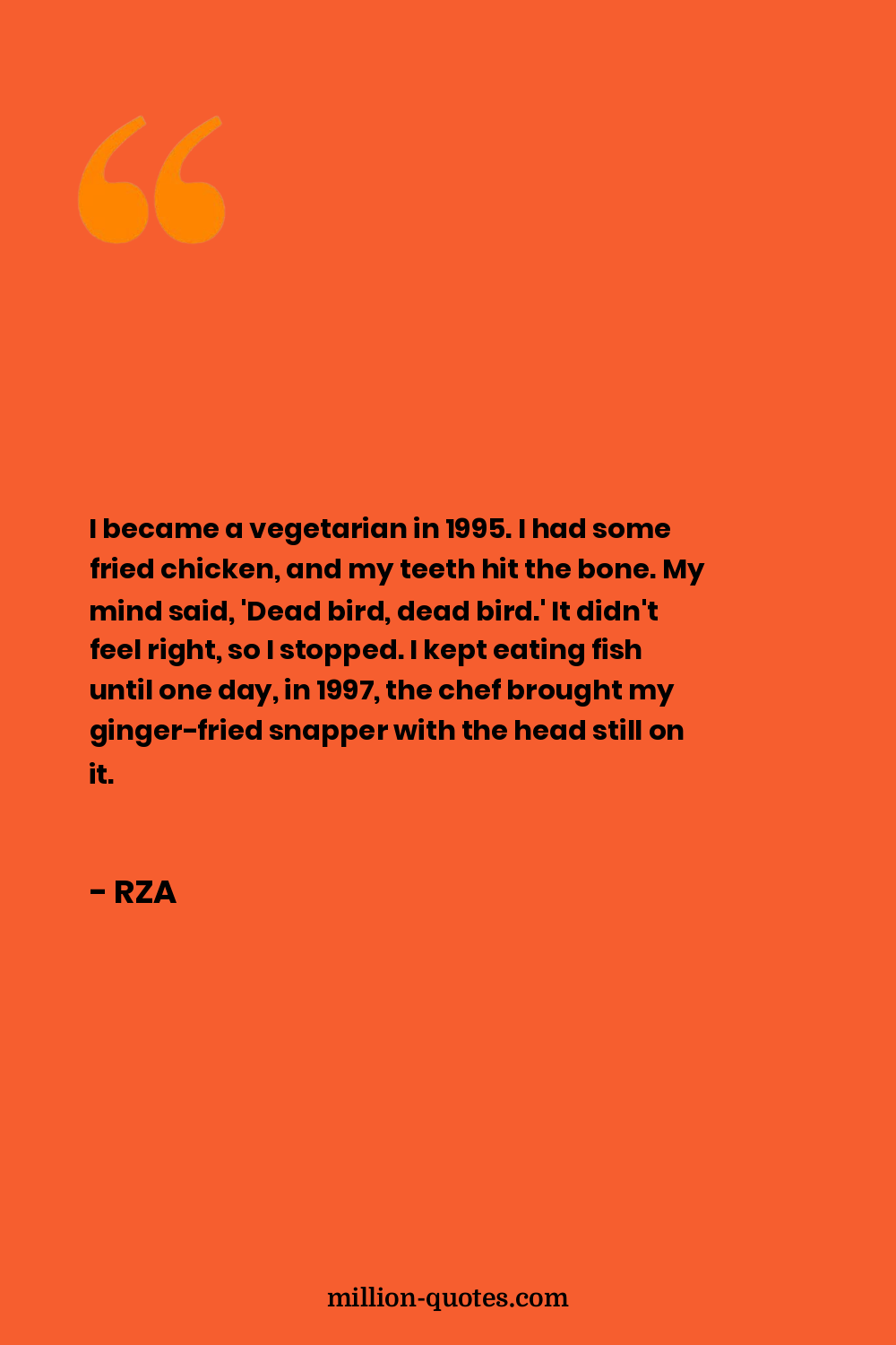 I became a vegetarian in 1995. I had some fried chicken, and my teeth hit the bone. My mind said, 'Dead bird, dead bird.' It didn't feel right, so I stopped. I kept eating fish until one day, in 1997, the chef brought my ginger-fried snapper with the head still on it.