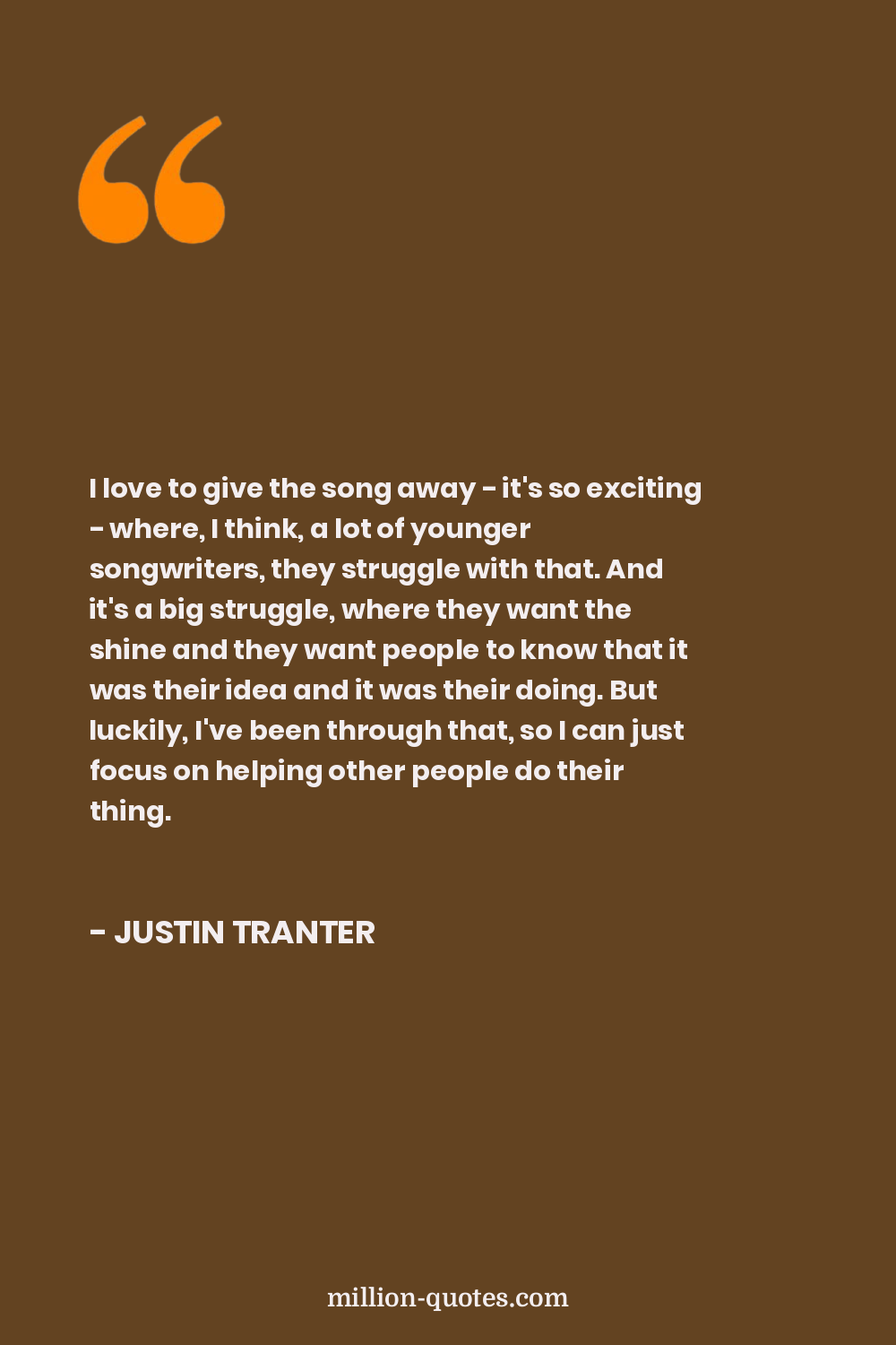I love to give the song away - it's so exciting - where, I think, a lot of younger songwriters, they struggle with that. And it's a big struggle, where they want the shine and they want people to know that it was their idea and it was their doing. But luckily, I've been through that, so I can just focus on helping other people do their thing.