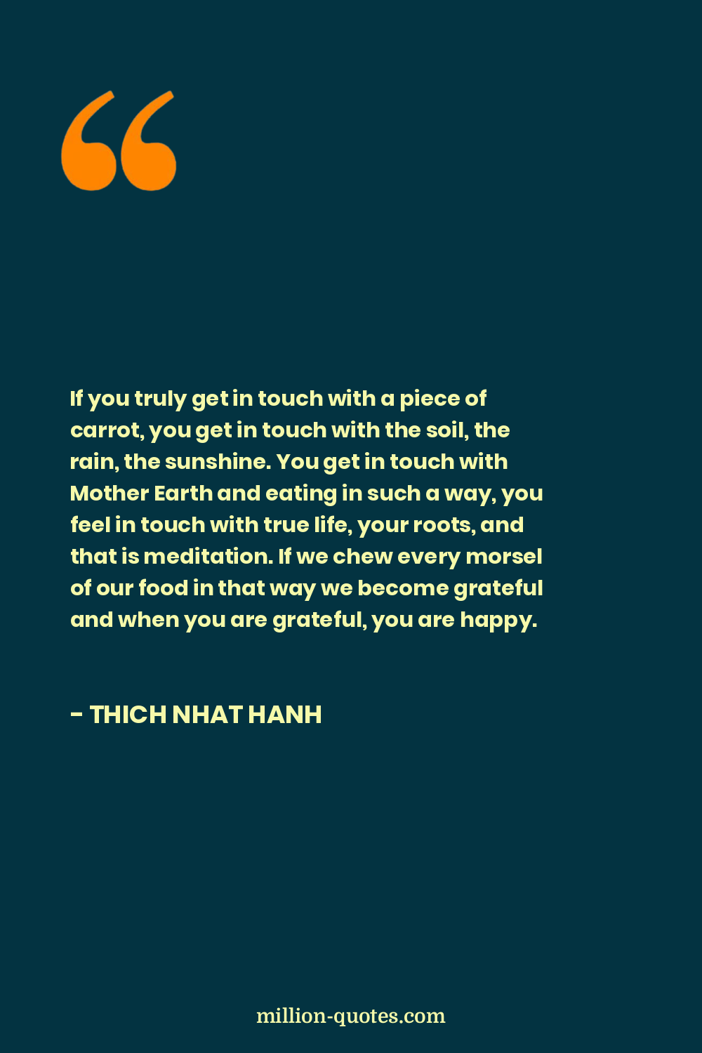 If you truly get in touch with a piece of carrot, you get in touch with the soil, the rain, the sunshine. You get in touch with Mother Earth and eating in such a way, you feel in touch with true life, your roots, and that is meditation. If we chew every morsel of our food in that way we become grateful and when you are grateful, you are happy.