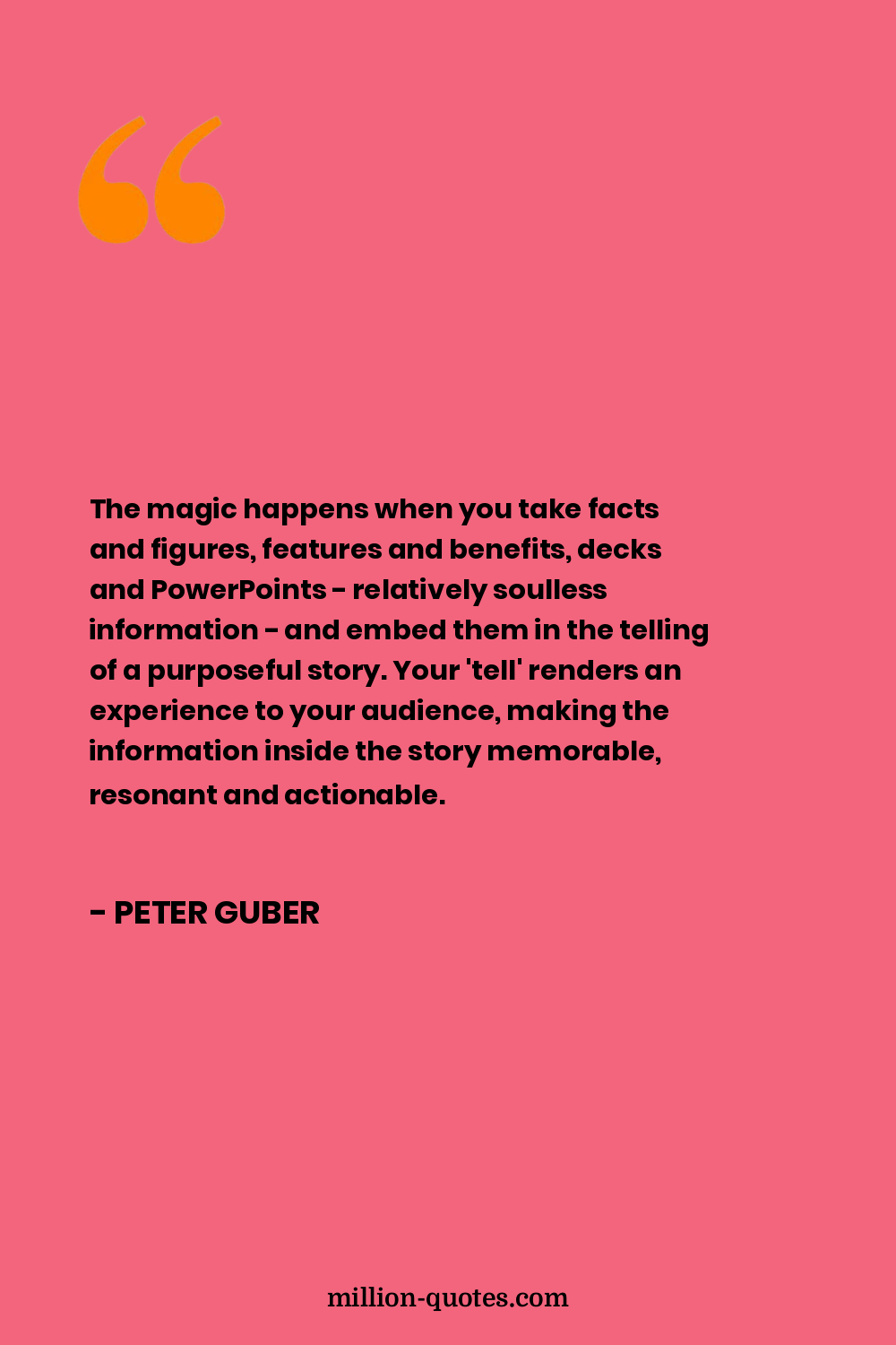 The magic happens when you take facts and figures, features and benefits, decks and PowerPoints - relatively soulless information - and embed them in the telling of a purposeful story. Your 'tell' renders an experience to your audience, making the information inside the story memorable, resonant and actionable.