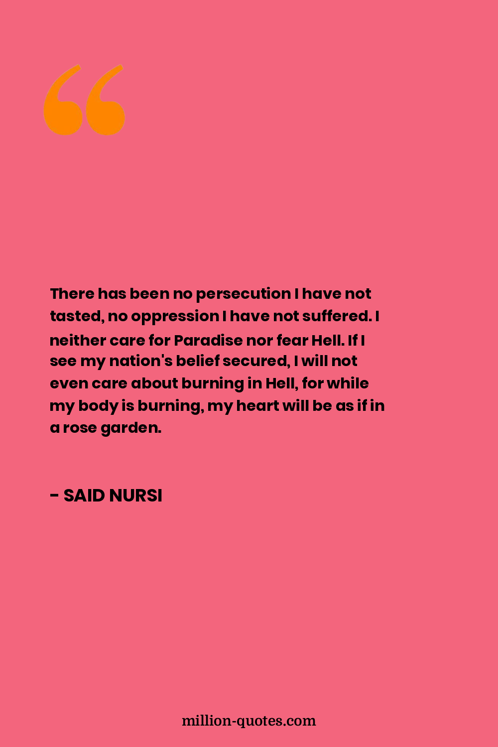 There has been no persecution I have not tasted, no oppression I have not suffered. I neither care for Paradise nor fear Hell. If I see my nation's belief secured, I will not even care about burning in Hell, for while my body is burning, my heart will be as if in a rose garden.