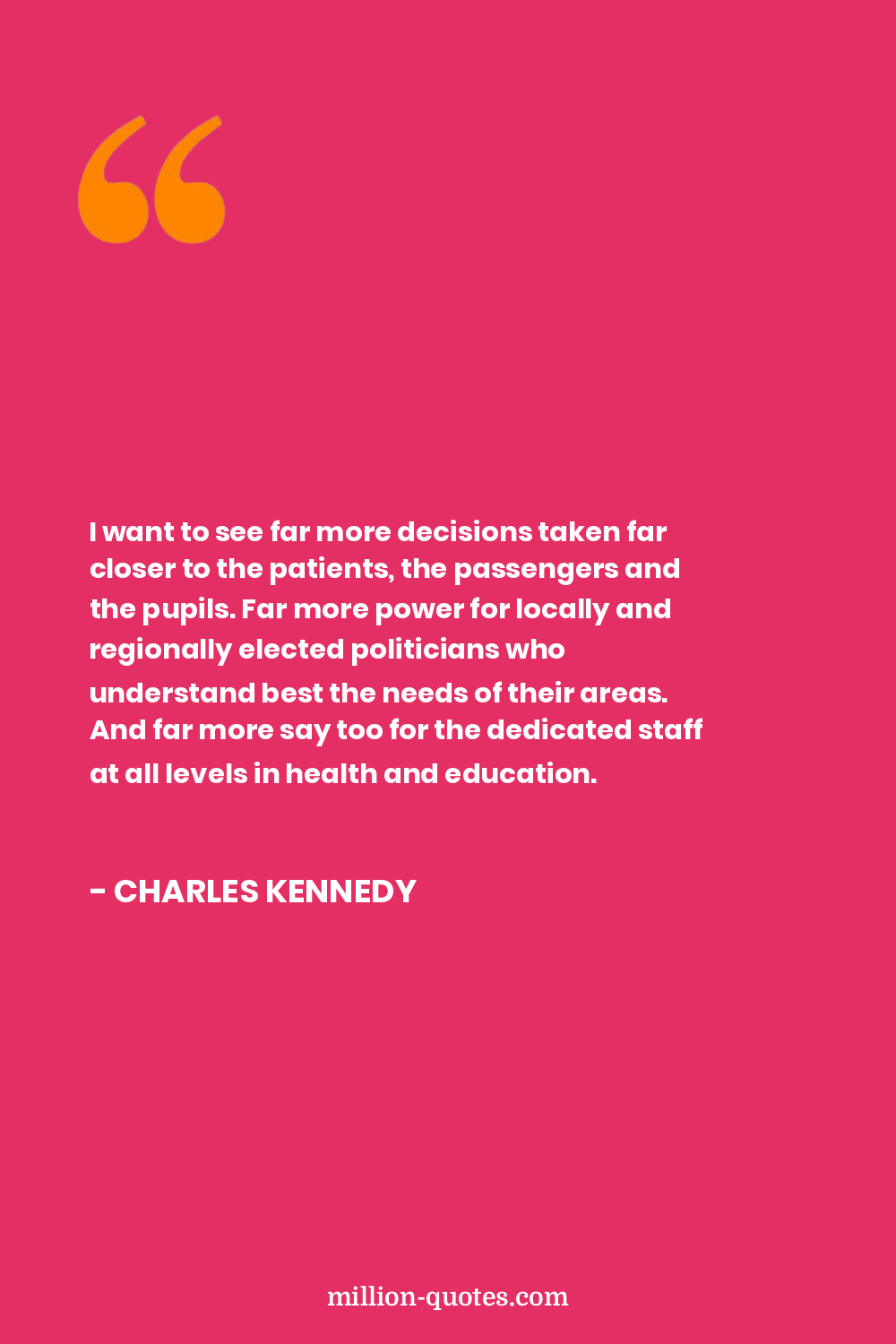 I want to see far more decisions taken far closer to the patients, the passengers and the pupils. Far more power for locally and regionally elected politicians who understand best the needs of their areas. And far more say too for the dedicated staff at all levels in health and education.