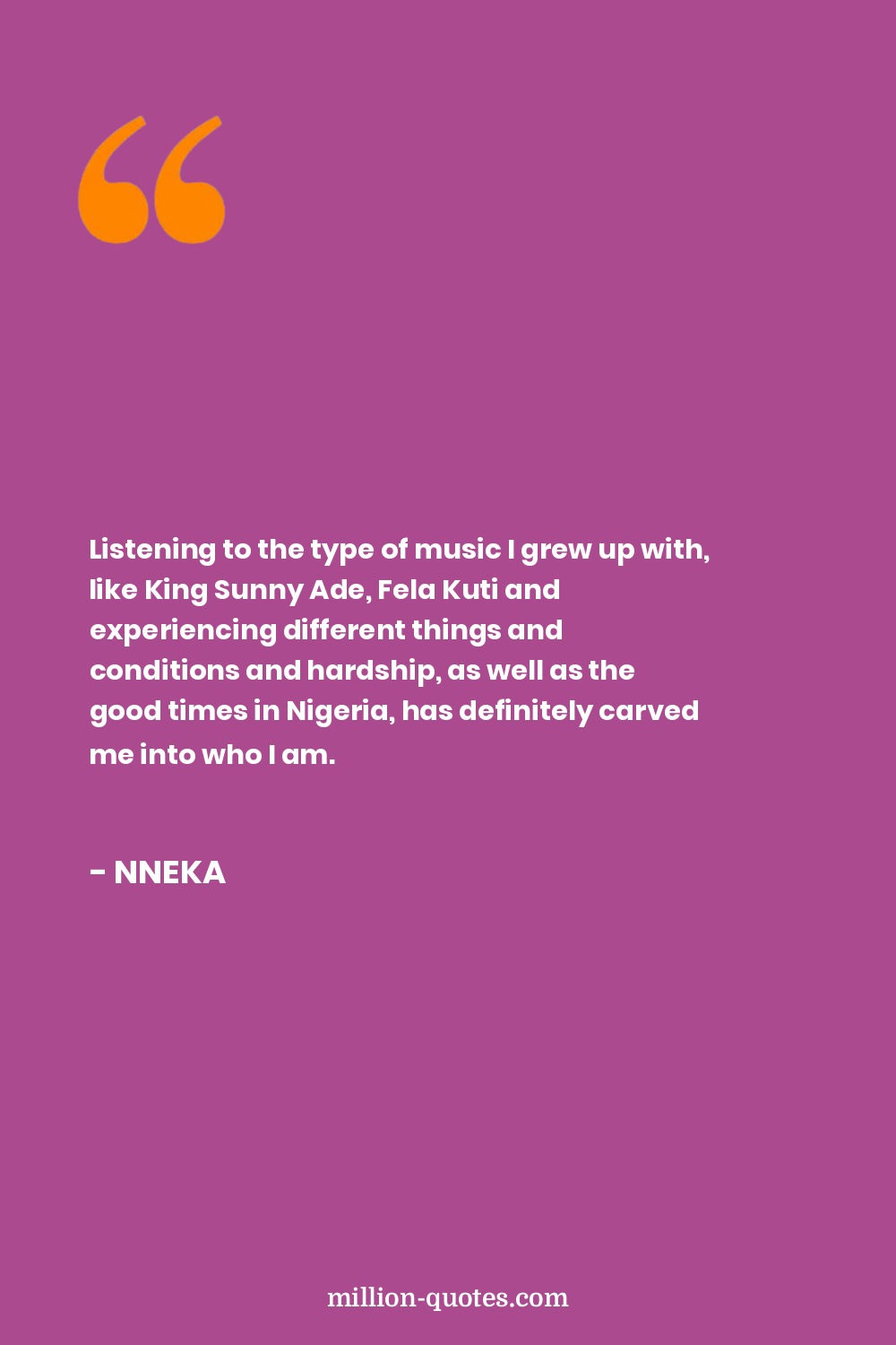 Listening to the type of music I grew up with, like King Sunny Ade, Fela Kuti and experiencing different things and conditions and hardship, as well as the good times in Nigeria, has definitely carved me into who I am.