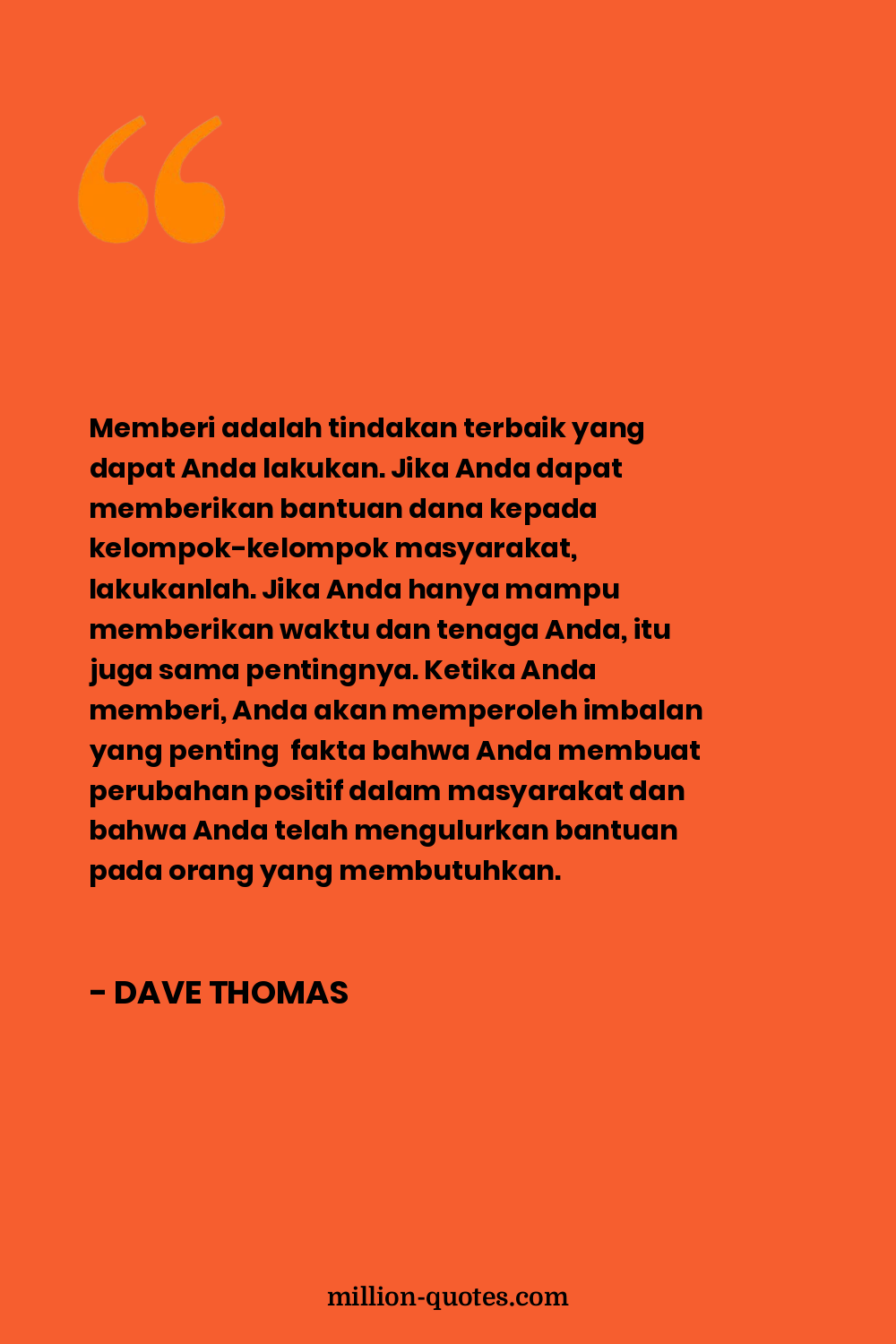 Memberi adalah tindakan terbaik yang dapat Anda lakukan. Jika Anda dapat memberikan bantuan dana kepada kelompok-kelompok masyarakat, lakukanlah. Jika Anda hanya mampu memberikan waktu dan tenaga Anda, itu juga sama pentingnya. Ketika Anda memberi, Anda akan memperoleh imbalan yang penting fakta bahwa Anda membuat perubahan positif dalam masyarakat dan bahwa Anda telah mengulurkan bantuan pada orang yang membutuhkan.