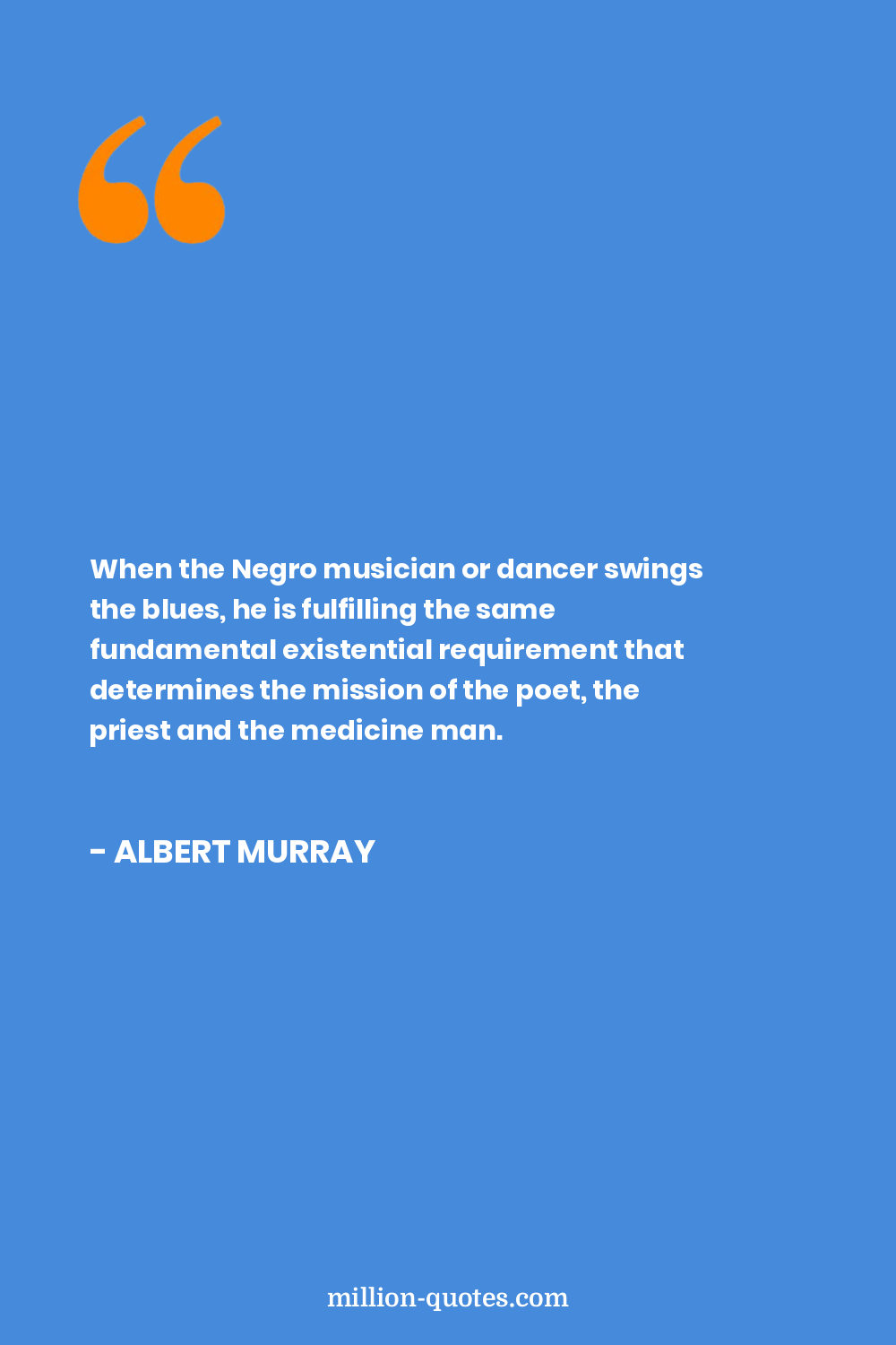 When the Negro musician or dancer swings the blues, he is fulfilling the same fundamental existential requirement that determines the mission of the poet, the priest and the medicine man.